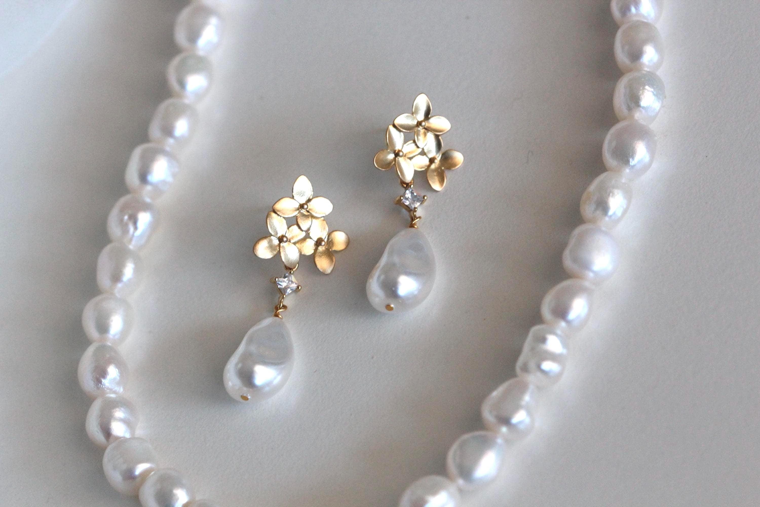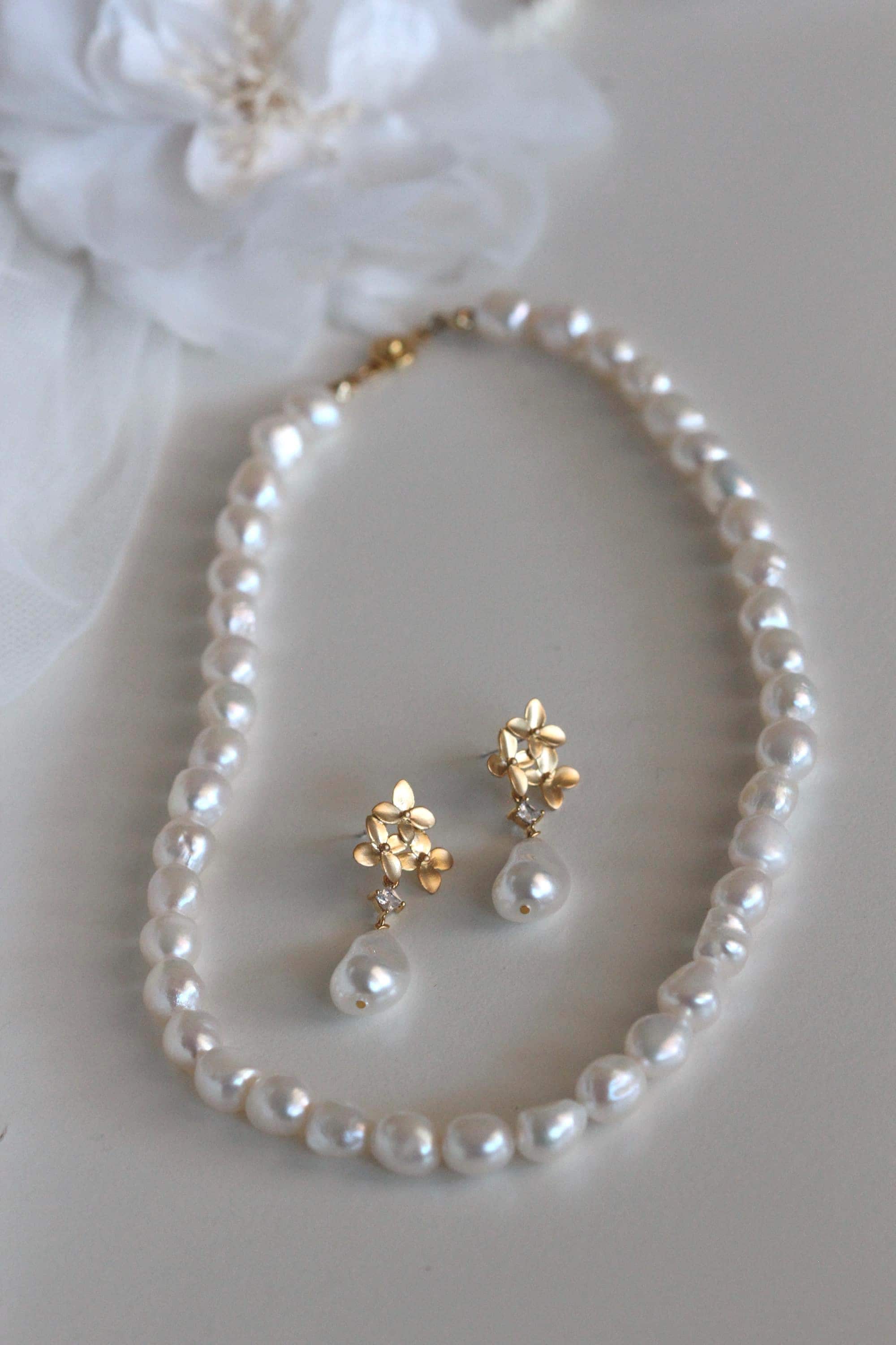 Handmade Elegant Gold Dainty Flower Baroque Teardrop Pearl Bridal Earrings with Fresh Water Pearl Bridal Necklace Set, Wedding Jewelry for Brides