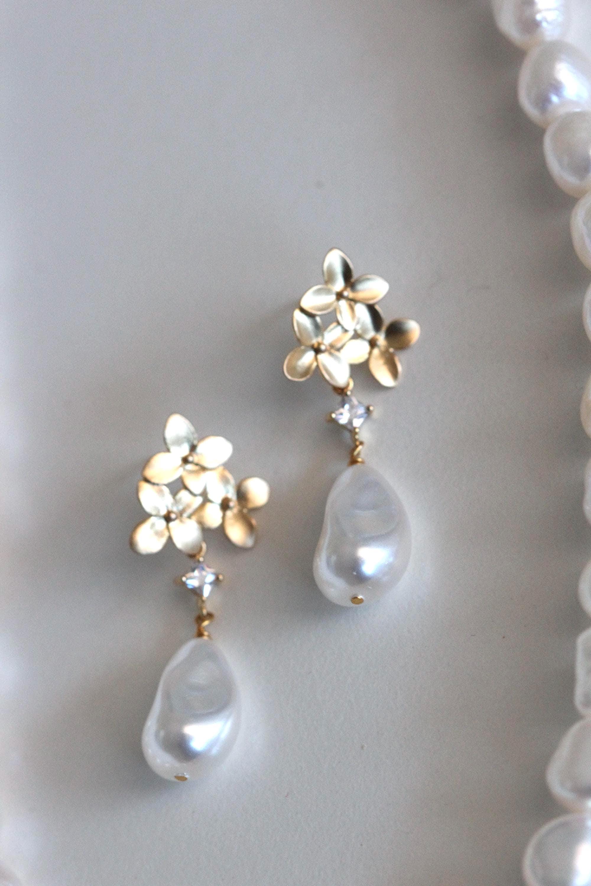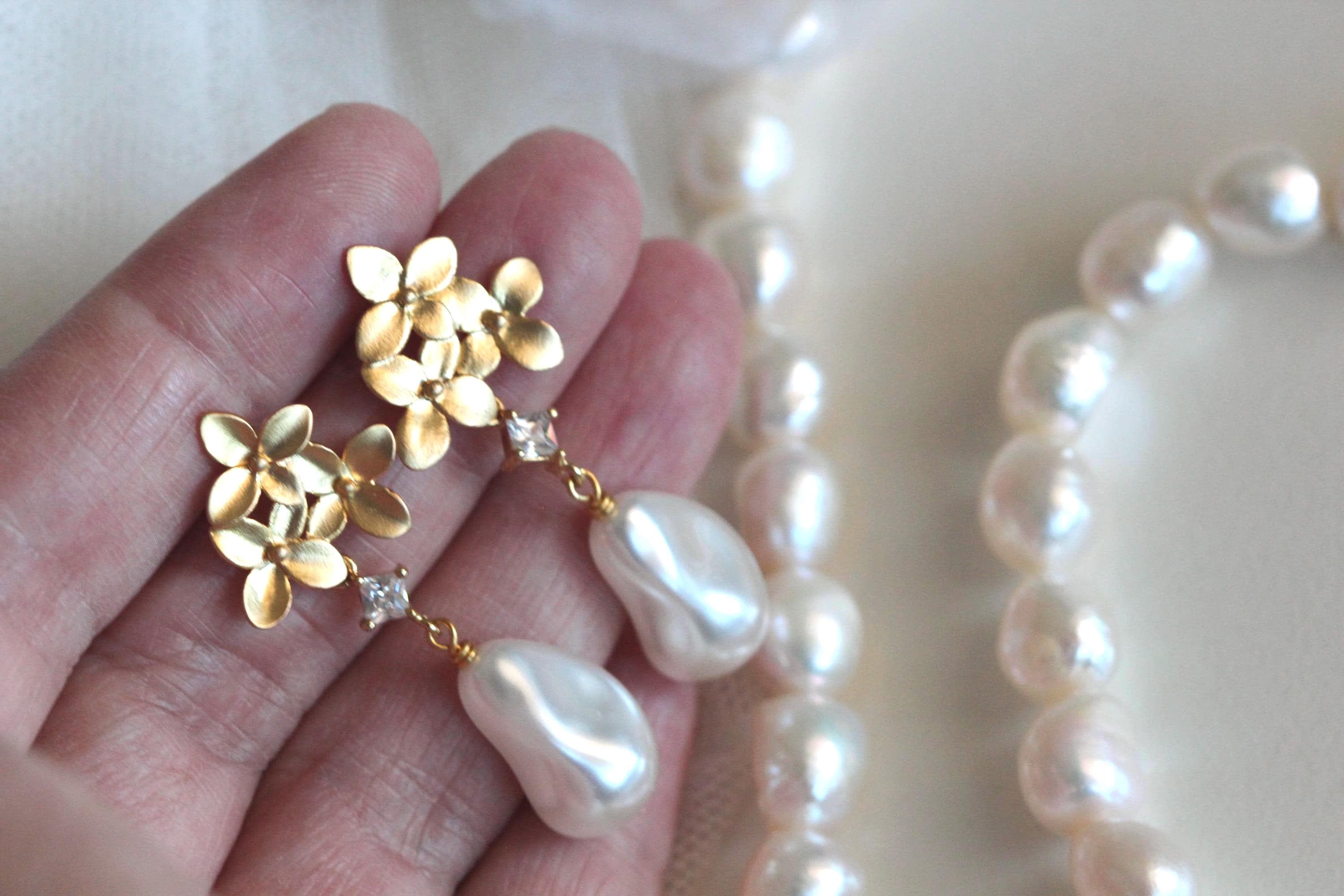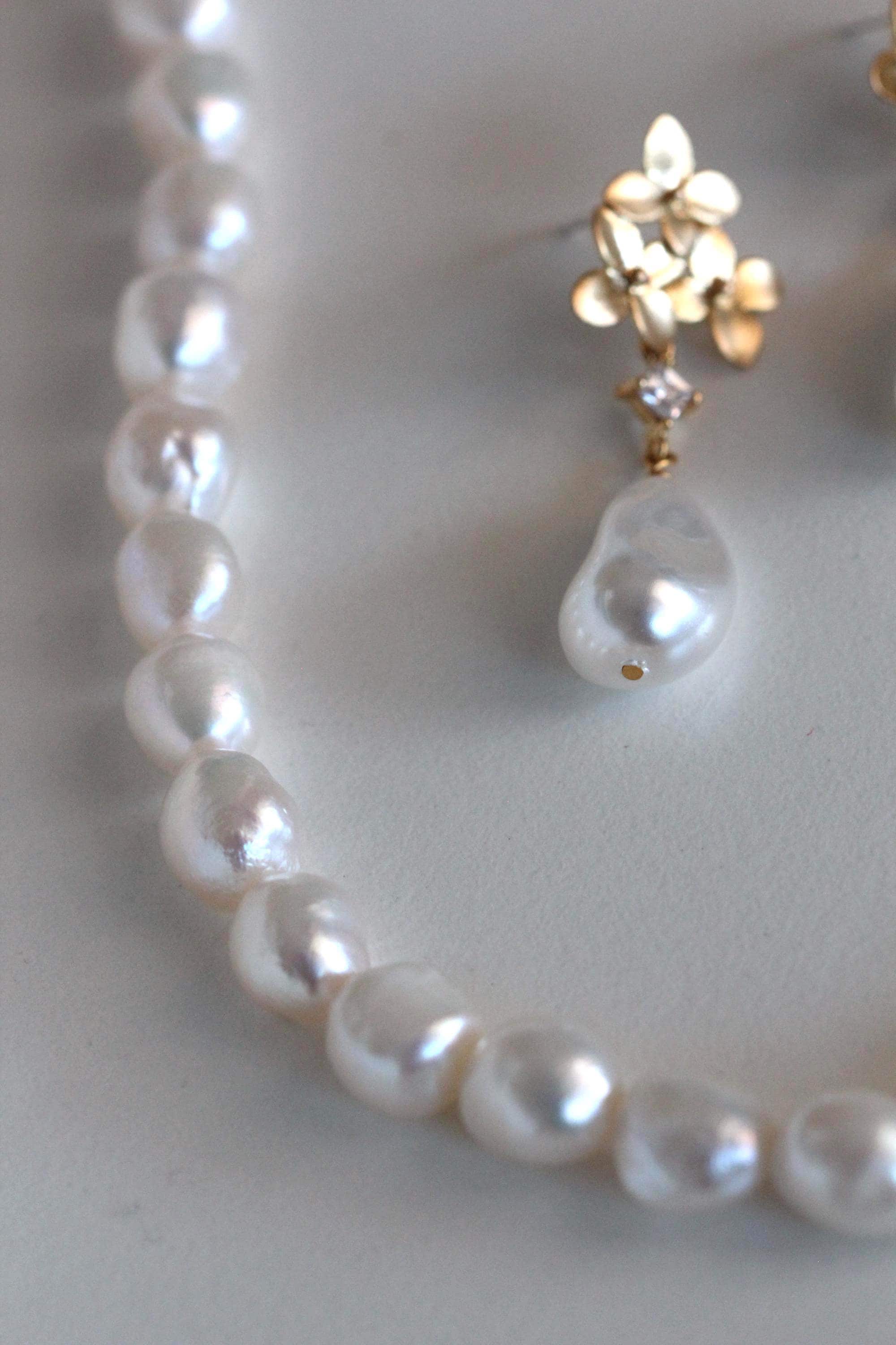 This elegant unique fresh water pearl necklace and gold floral pearl earring set is made with Finest European Premium teardrop baroque white ivory crystal pearl which is a classic nature pearl color with a contemporary twist! Matte and shiny at the same time, full of purity and calmness.