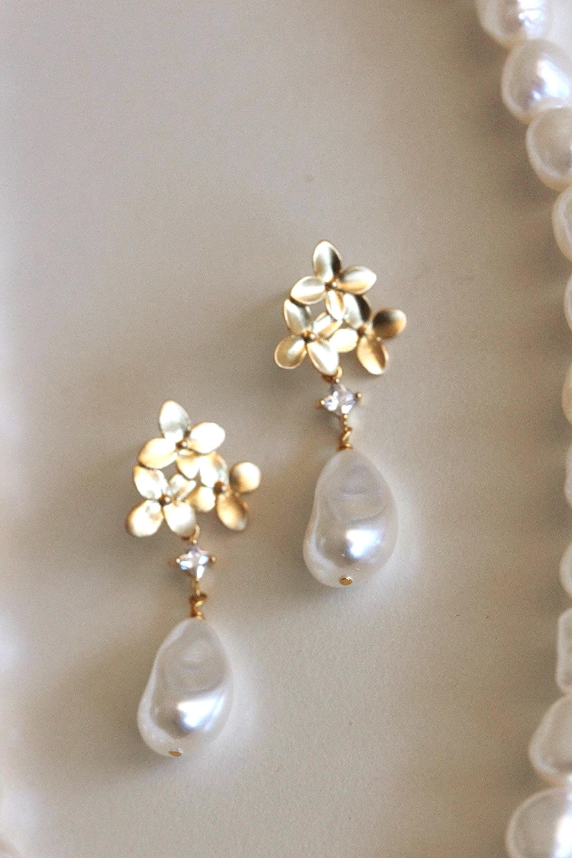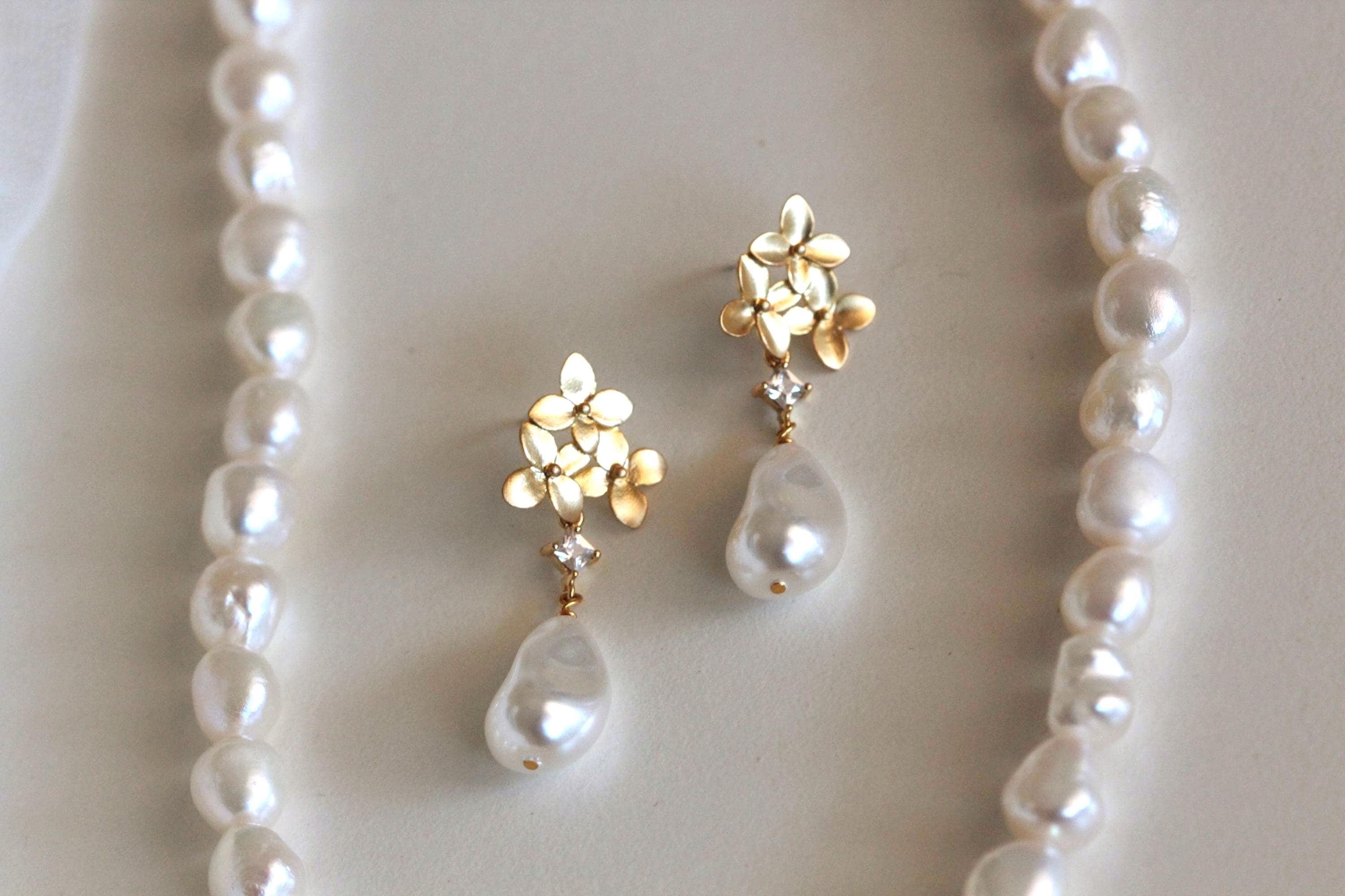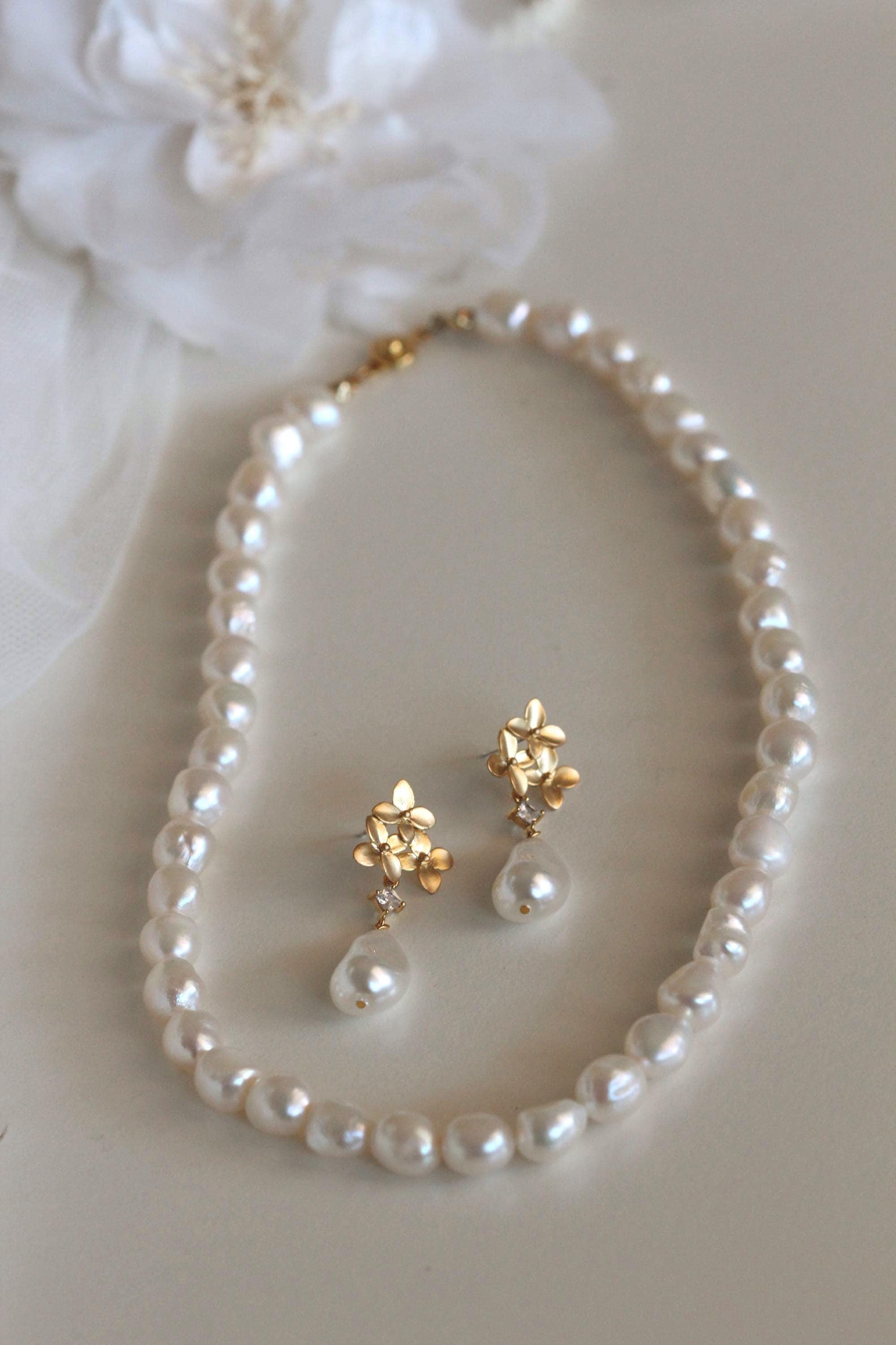 Handmade Elegant Gold Dainty Flower Baroque Teardrop Pearl Bridal Earrings with Fresh Water Pearl Bridal Necklace Set, Wedding Jewelry for Brides