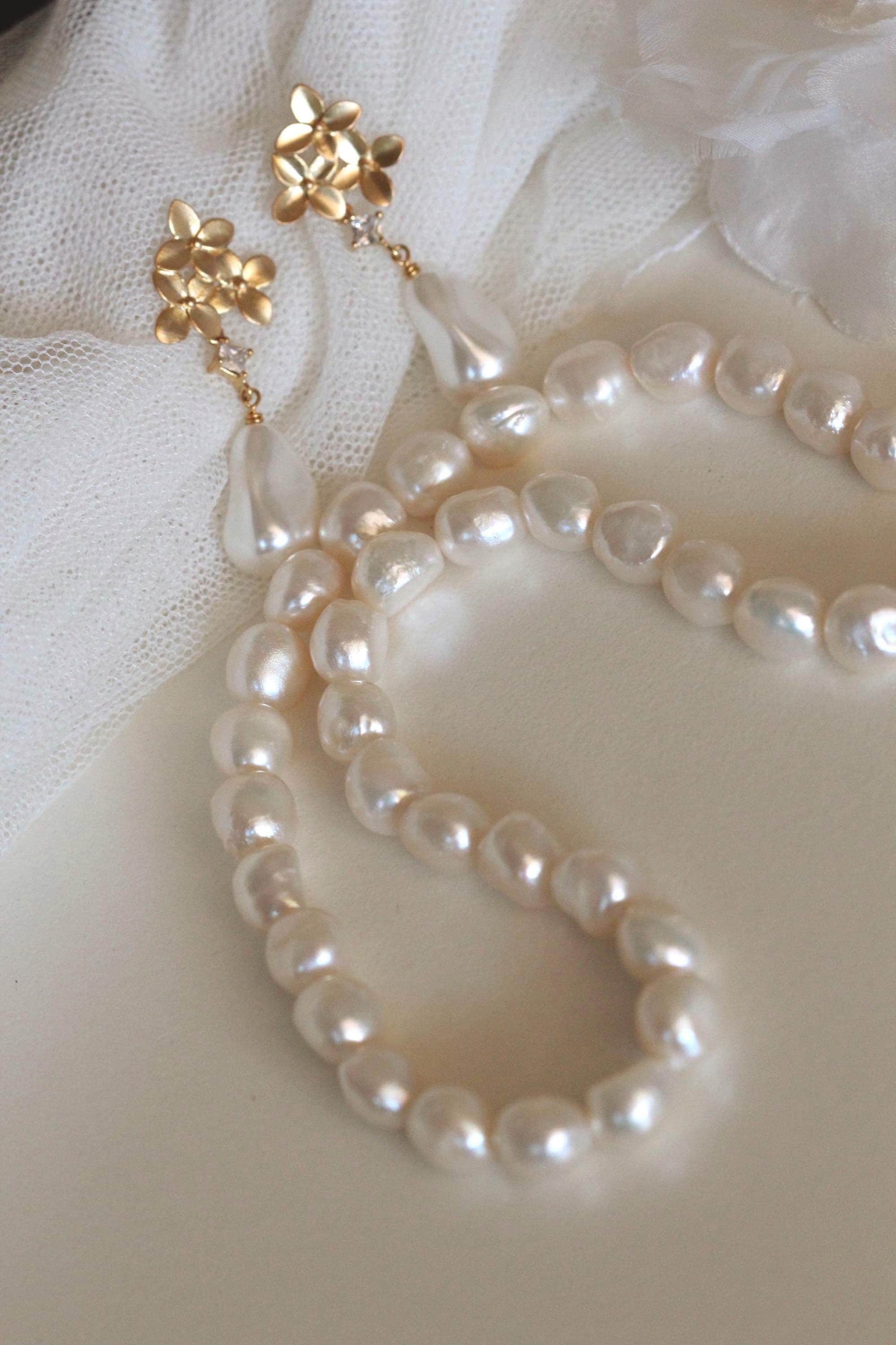 This elegant unique fresh water pearl necklace and gold floral pearl earring set is made with Finest European Premium teardrop baroque white ivory crystal pearl which is a classic nature pearl color with a contemporary twist! Matte and shiny at the same time, full of purity and calmness.