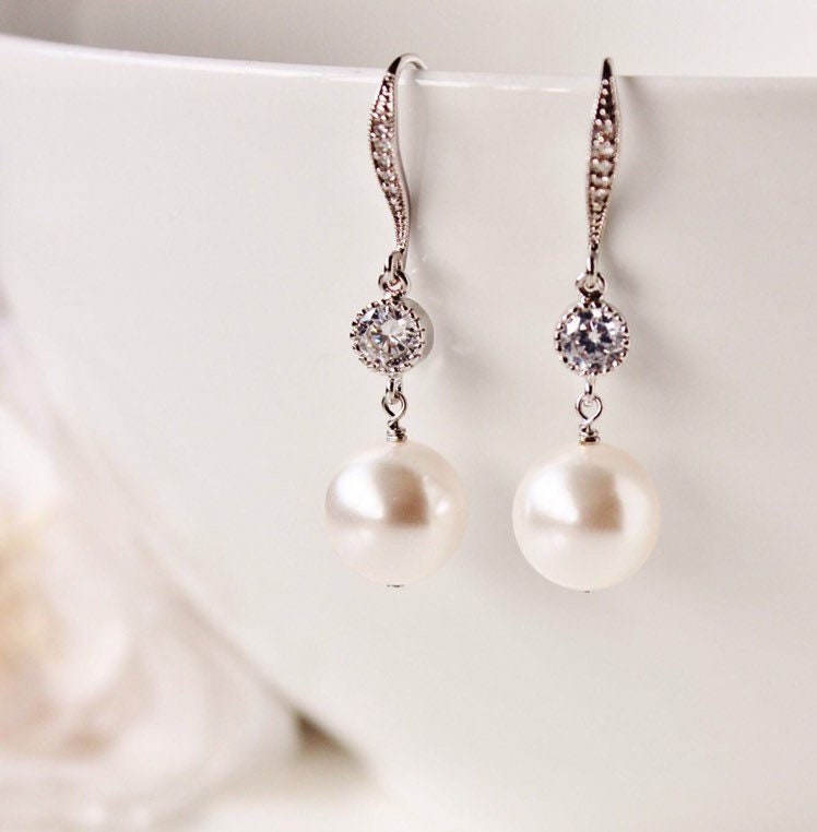 Pearl Wedding Jewelry Crystal Pearl Bridal Earrings White Ivory Round Pearl Earrings bridal jewelry pearl bridesmaid earrings maid of honor gift.