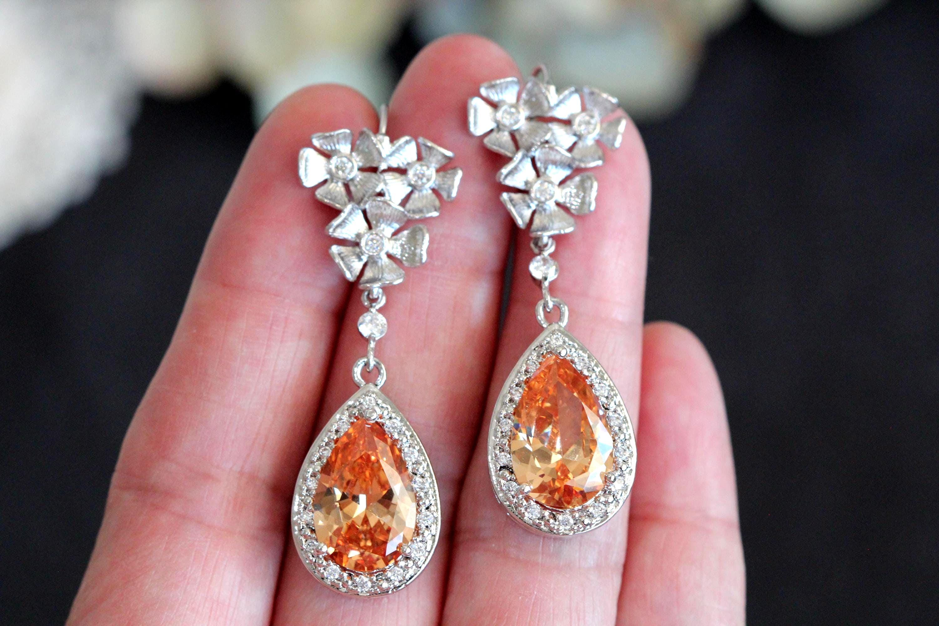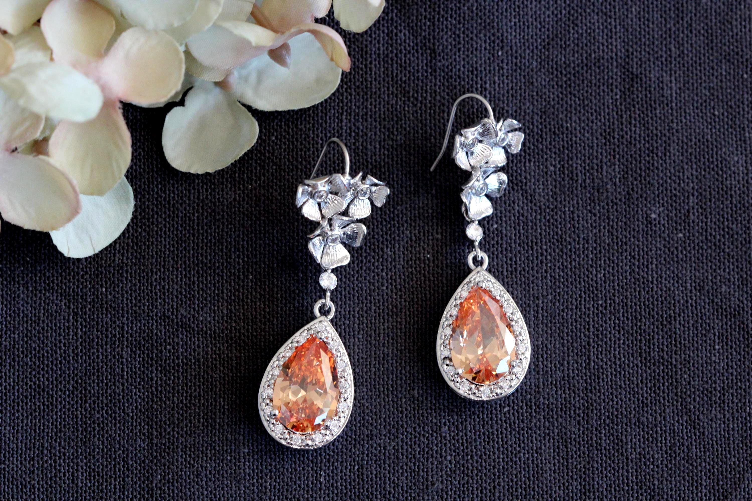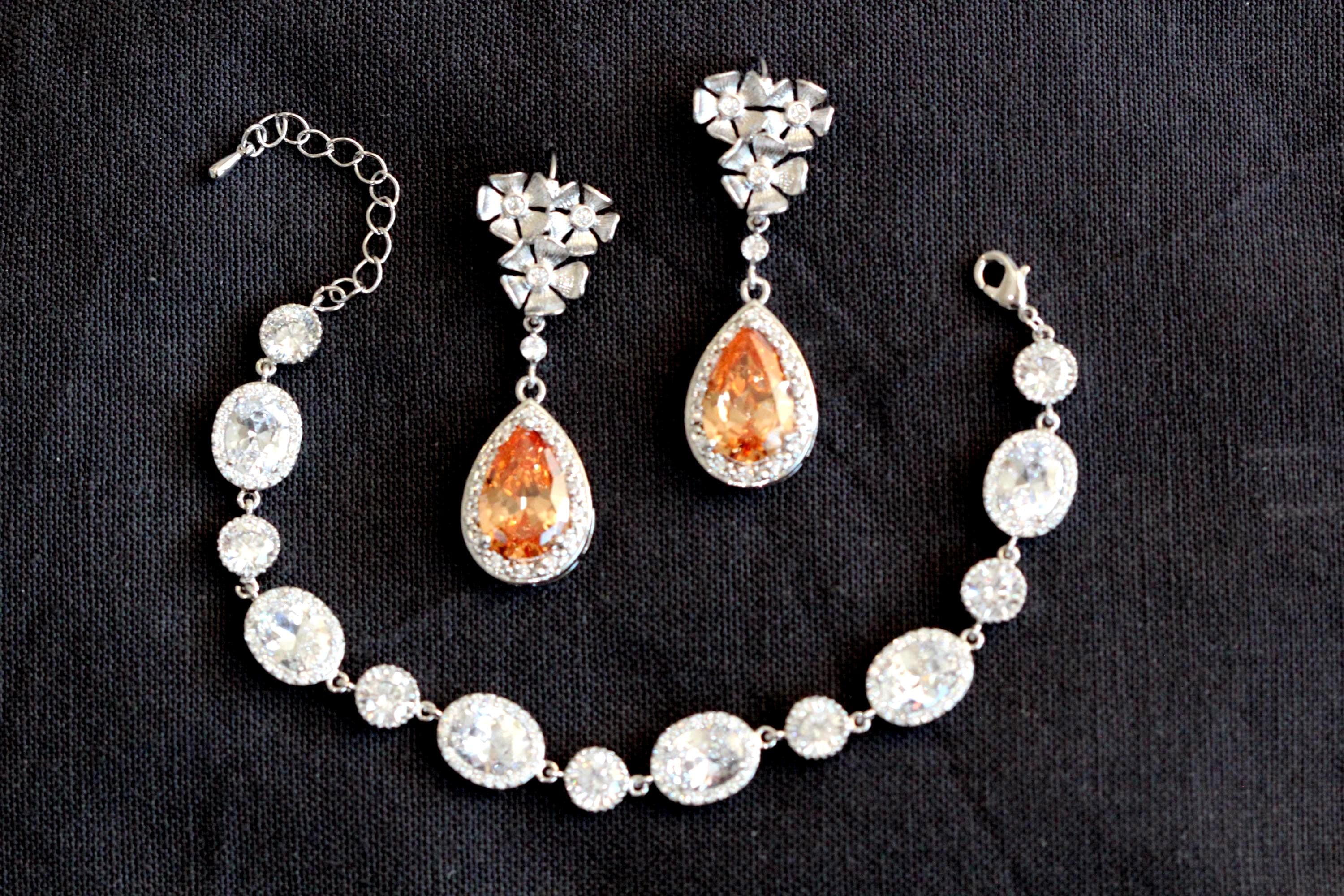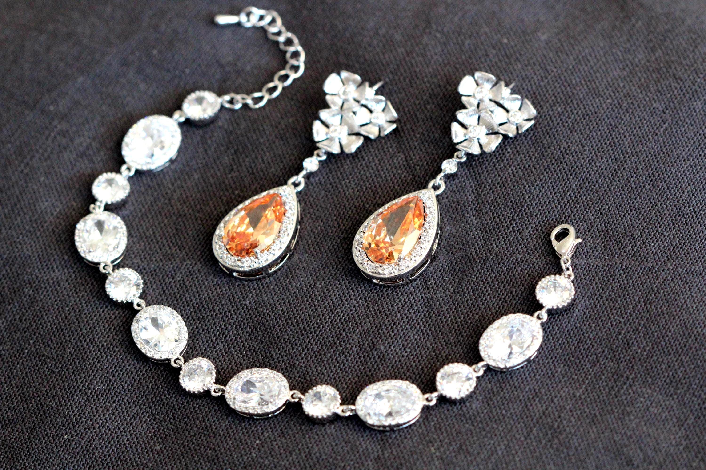 Fall Bridal Jewelry Set – Champagne Teardrop Bridal Earrings and Bracelet Set, Statement Wedding Jewelry Gift for Bride Formal Jewelry