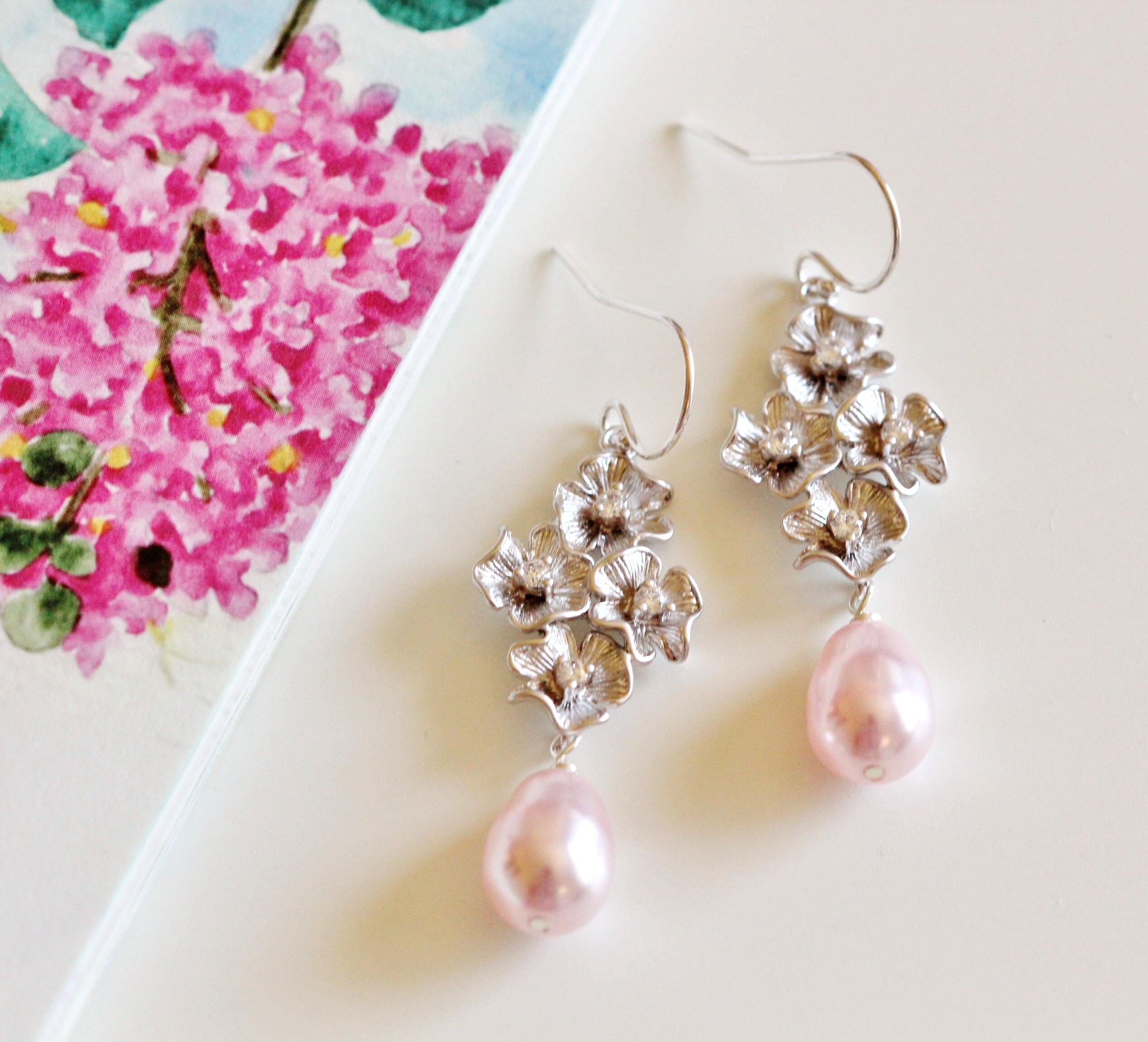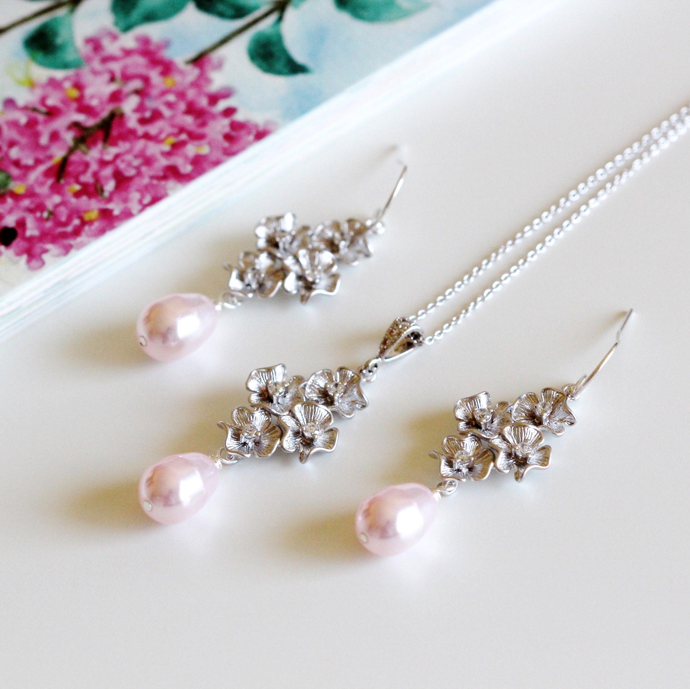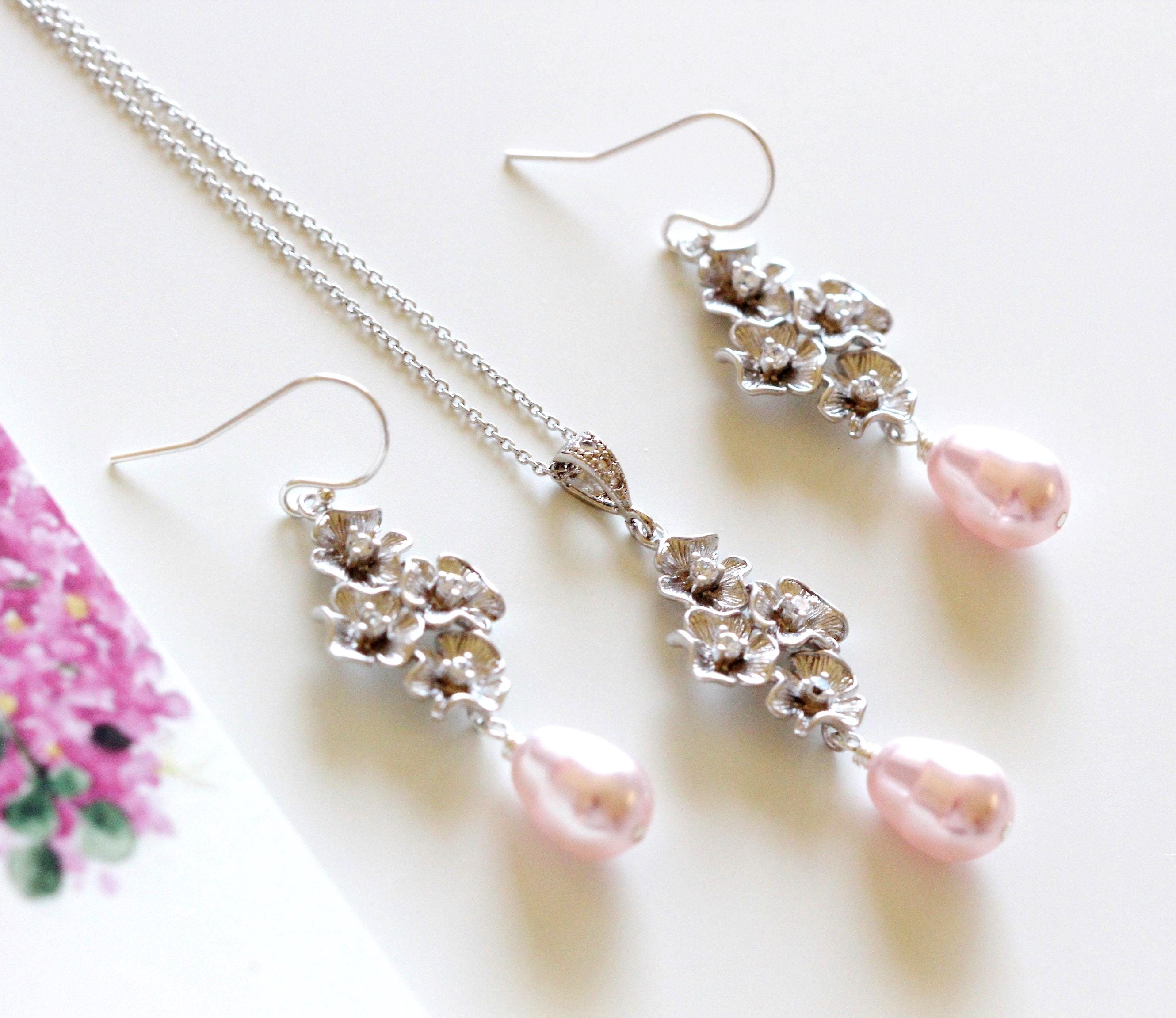 Romantic & Elegant Rose Pink Pearl Bridal Earrings Cherry Blossom Sakura Flower Romantic Spring Wedding Jewelry Bridesmaid Earrings Teardrop Blush Pink Pearl Earrings Silver flower necklace