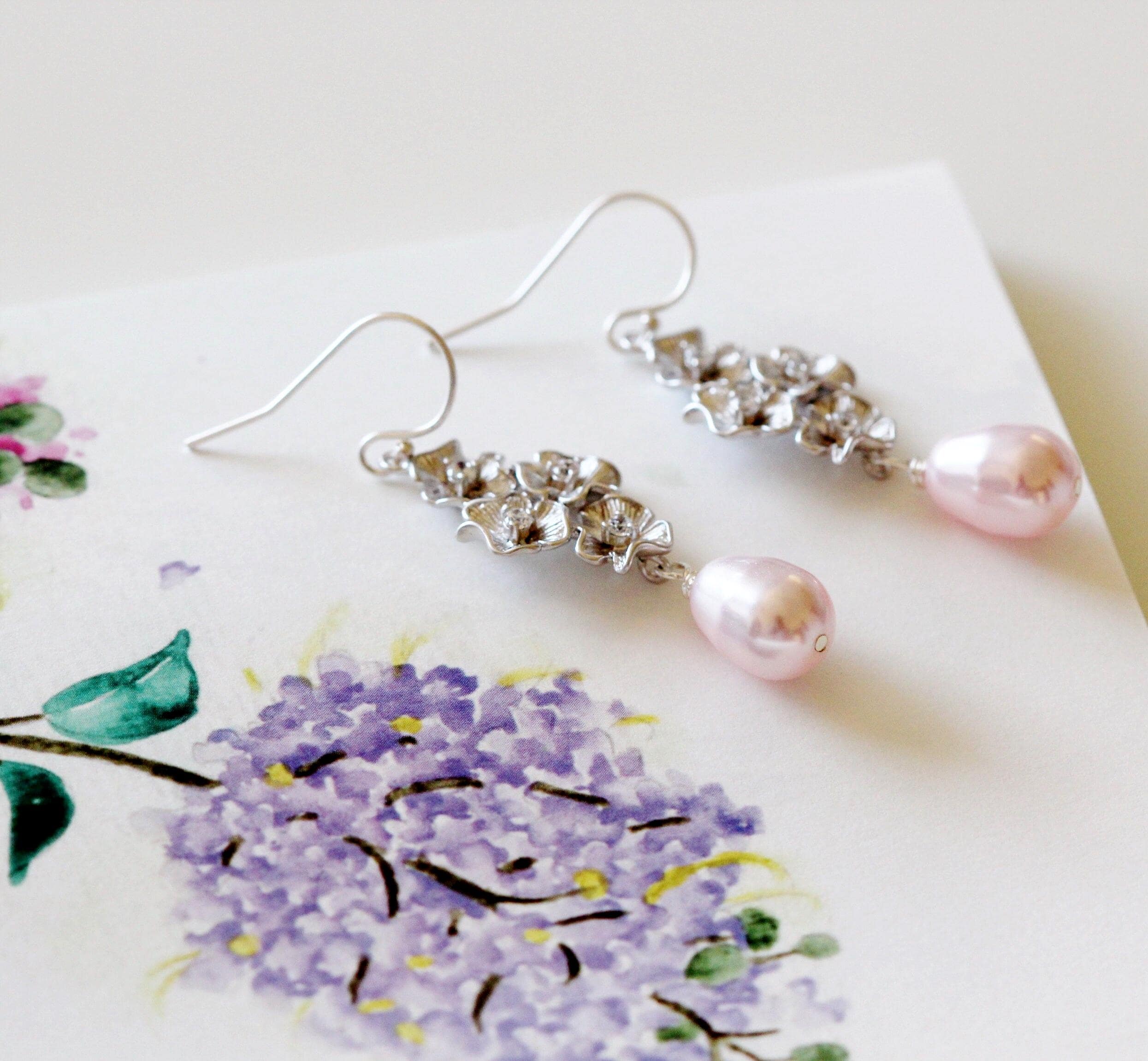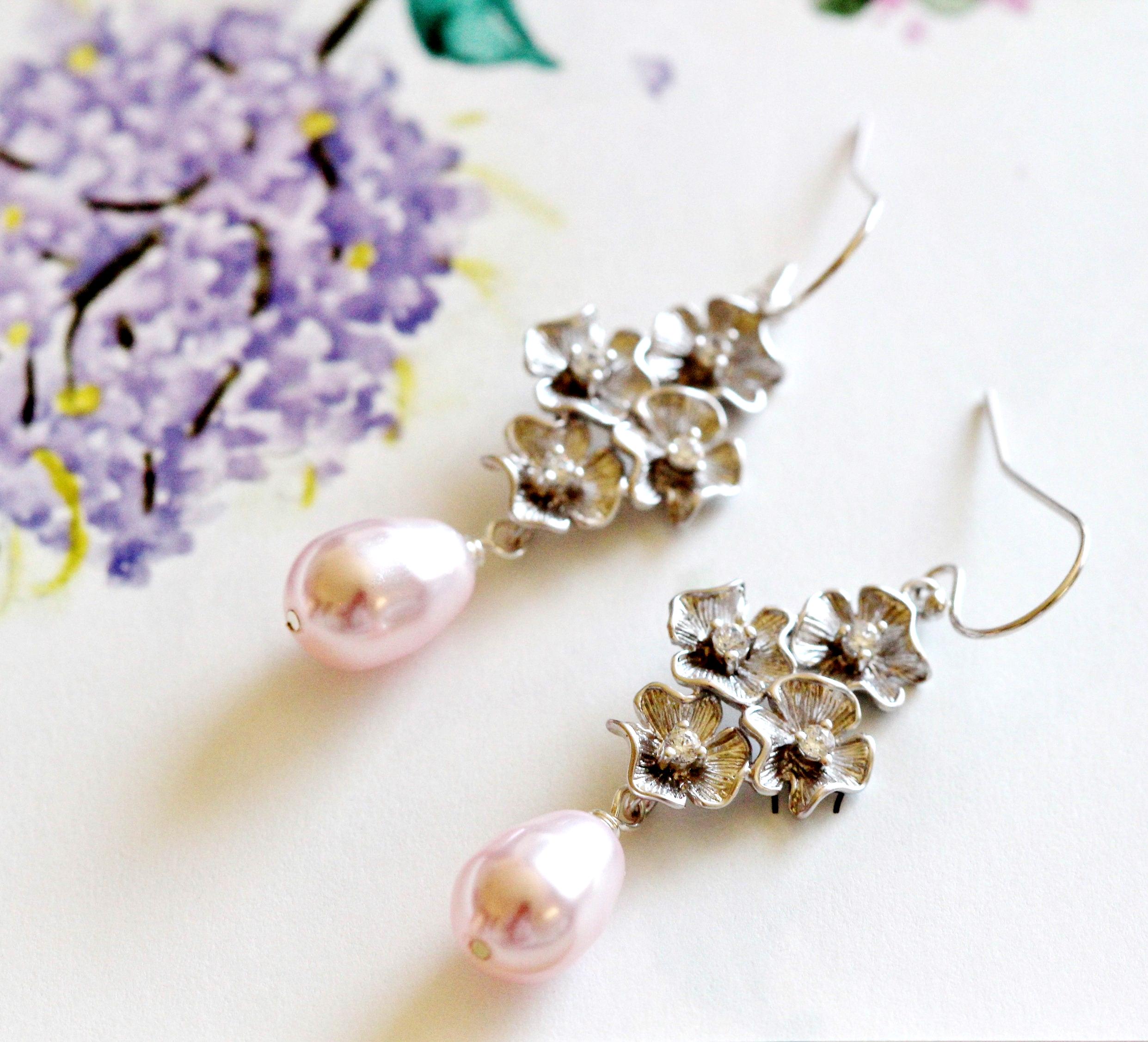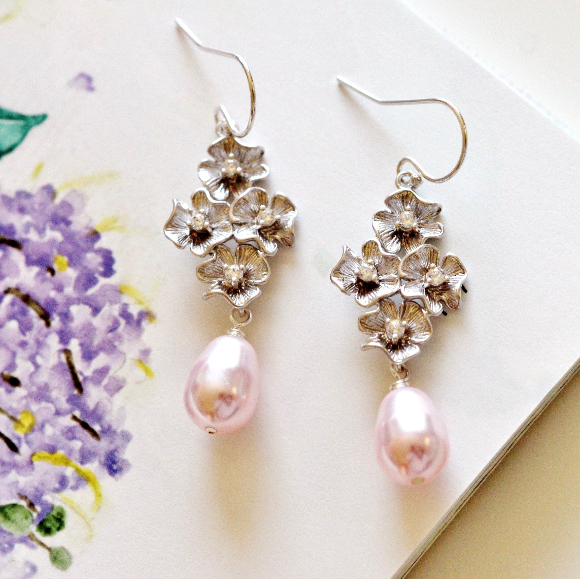 Romantic & Elegant Rose Pink Pearl Bridal Earrings Cherry Blossom Sakura Flower Romantic Spring Wedding Jewelry Bridesmaid Earrings Teardrop Blush Pink Pearl Earrings Silver flower necklace