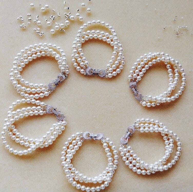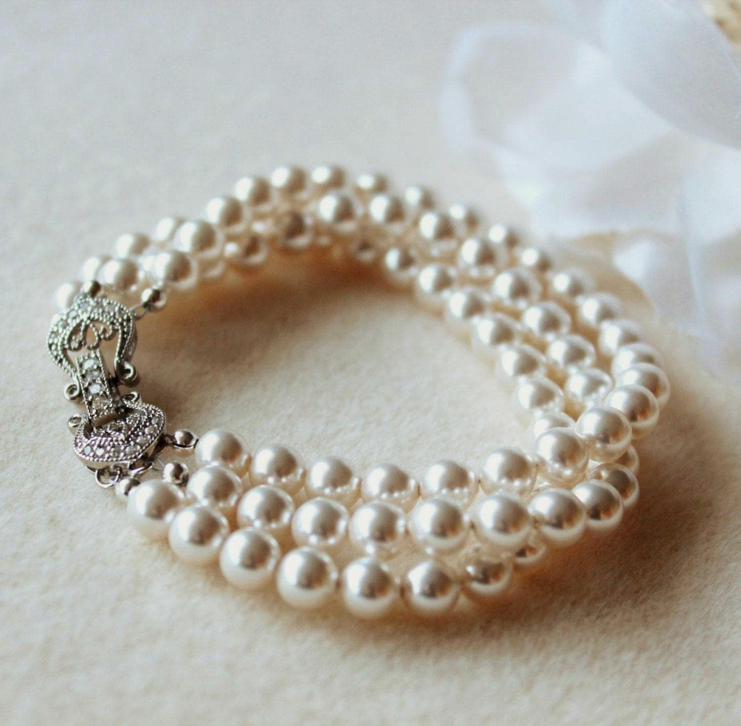 Elegant and Gorgeous Wedding Pearl Jewelry Pearl Bridal Bracelet Three Strand Finest Austrian crystal Pearl Bracelet cubic zirconia clasp bracelet Bridal Jewelry Bridal Bracelet