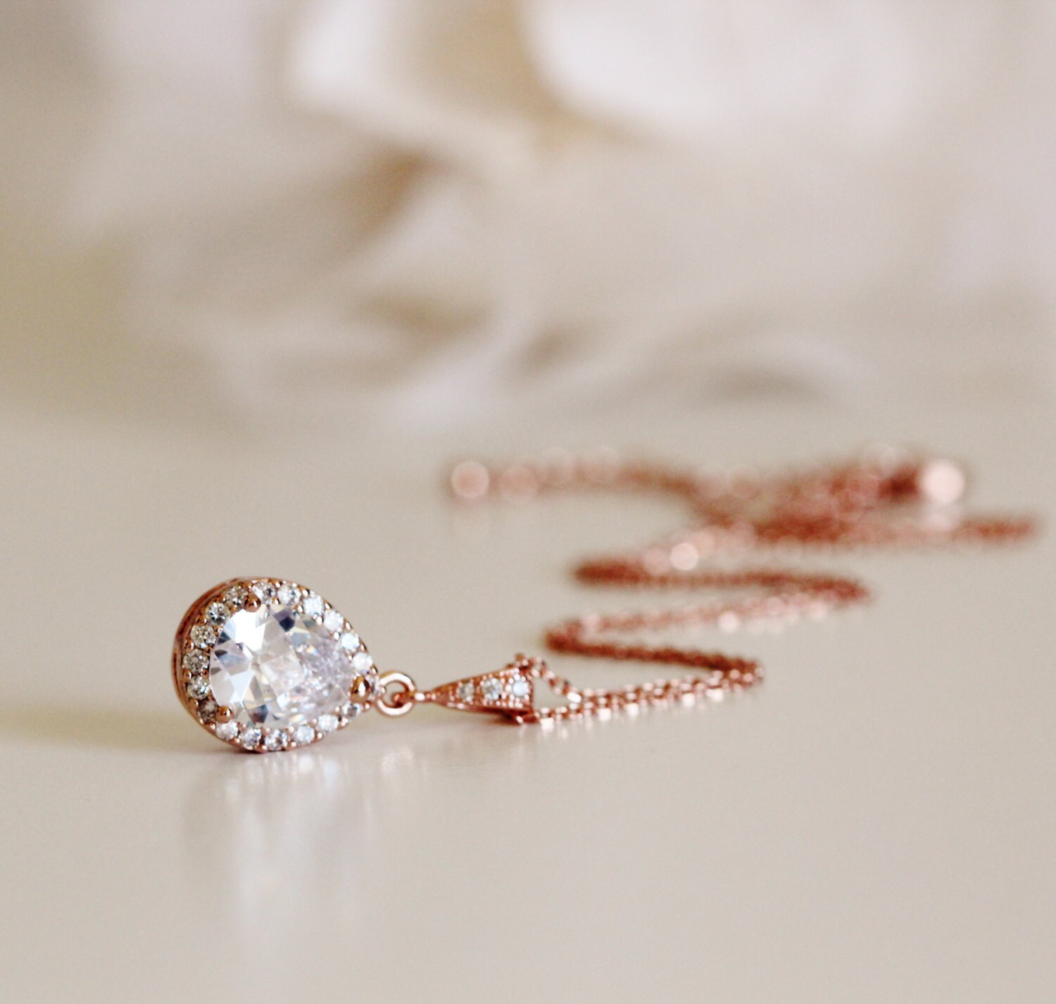 Rose Gold Wedding Necklace Rose Gold Bridal Necklace Rose Gold Necklace Luxury Cubic Zirconia teardrop pendant necklace Bridesmaid Gift Bridesmaid Necklace