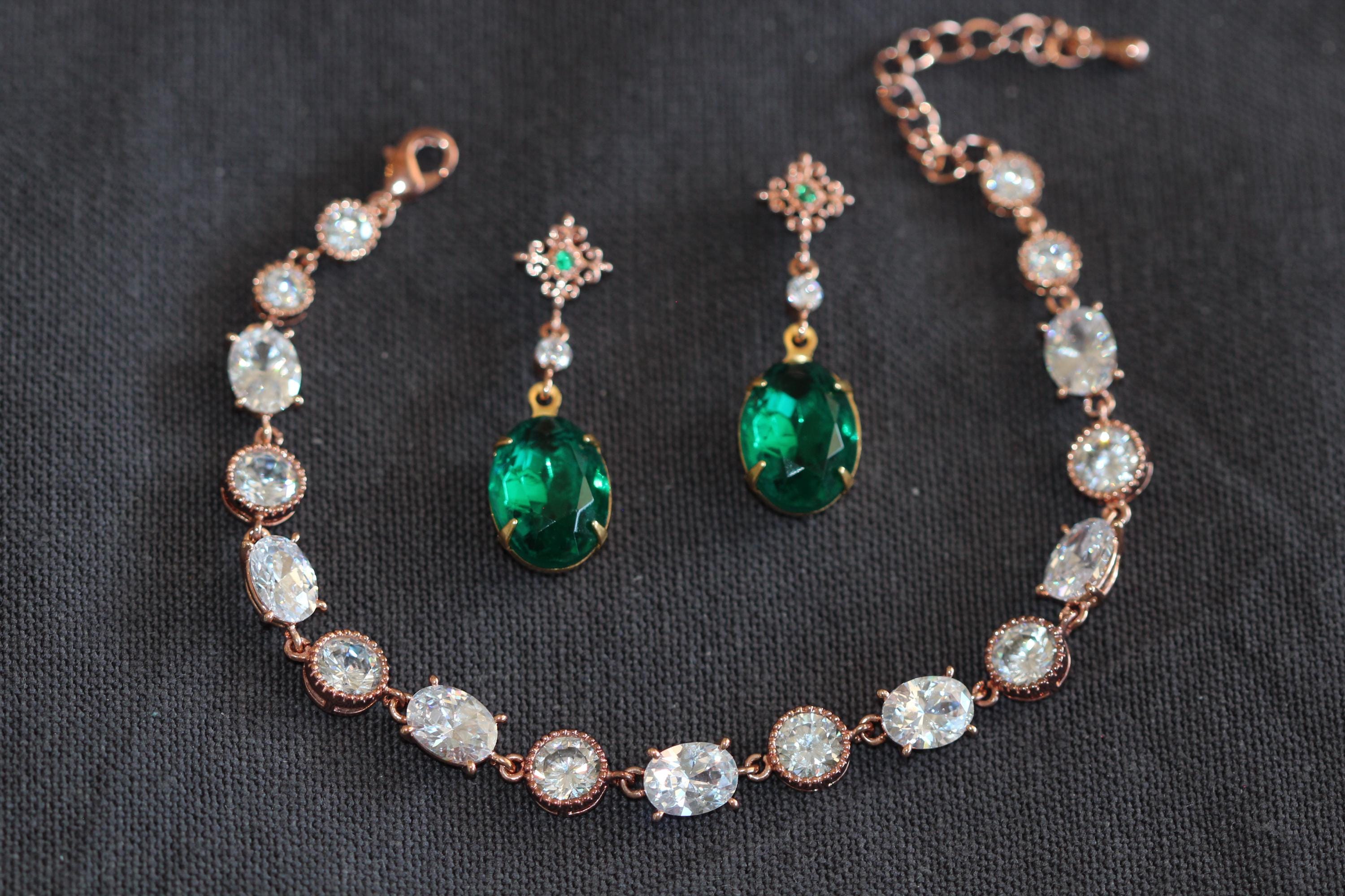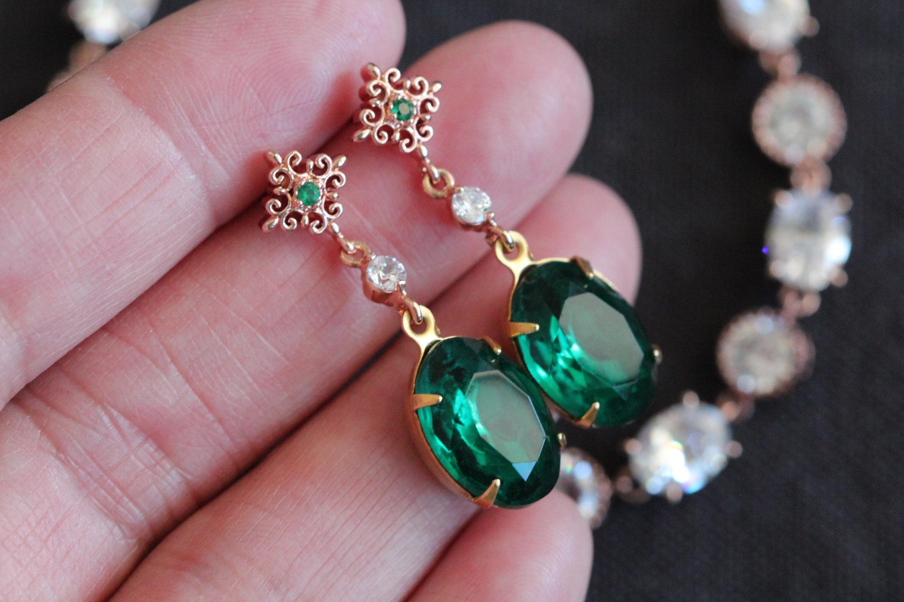 These rich emerald green earrings bring vintage glamour to your bridal party look. Perfect as bridesmaid gifts or statement accessories for jewel-toned weddings, they add elegance and sparkle to any celebration.