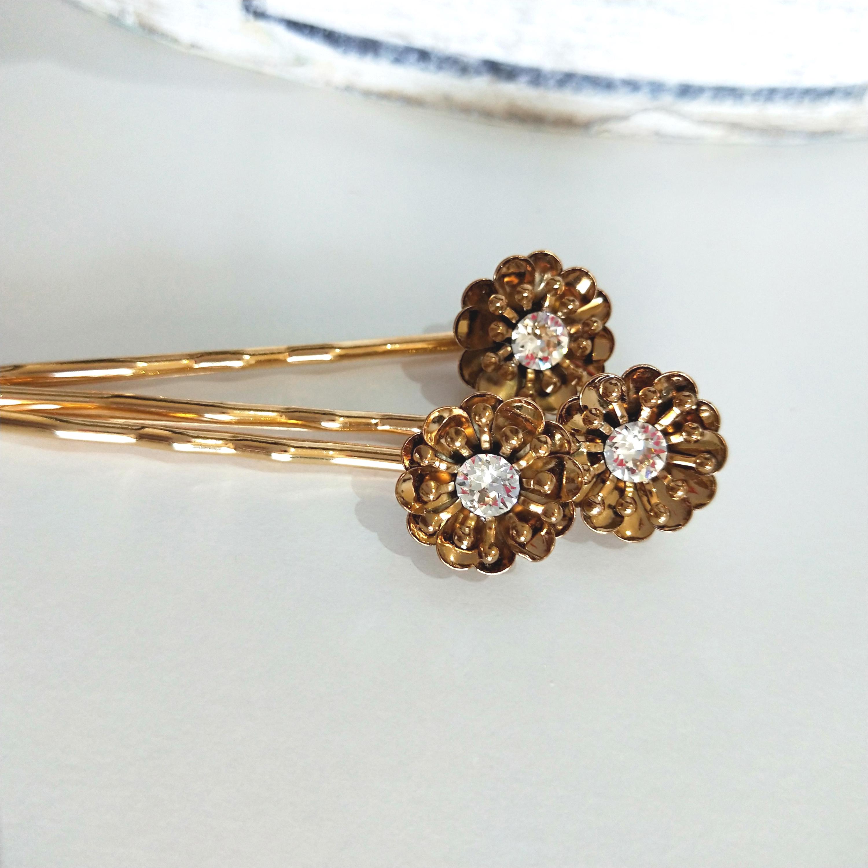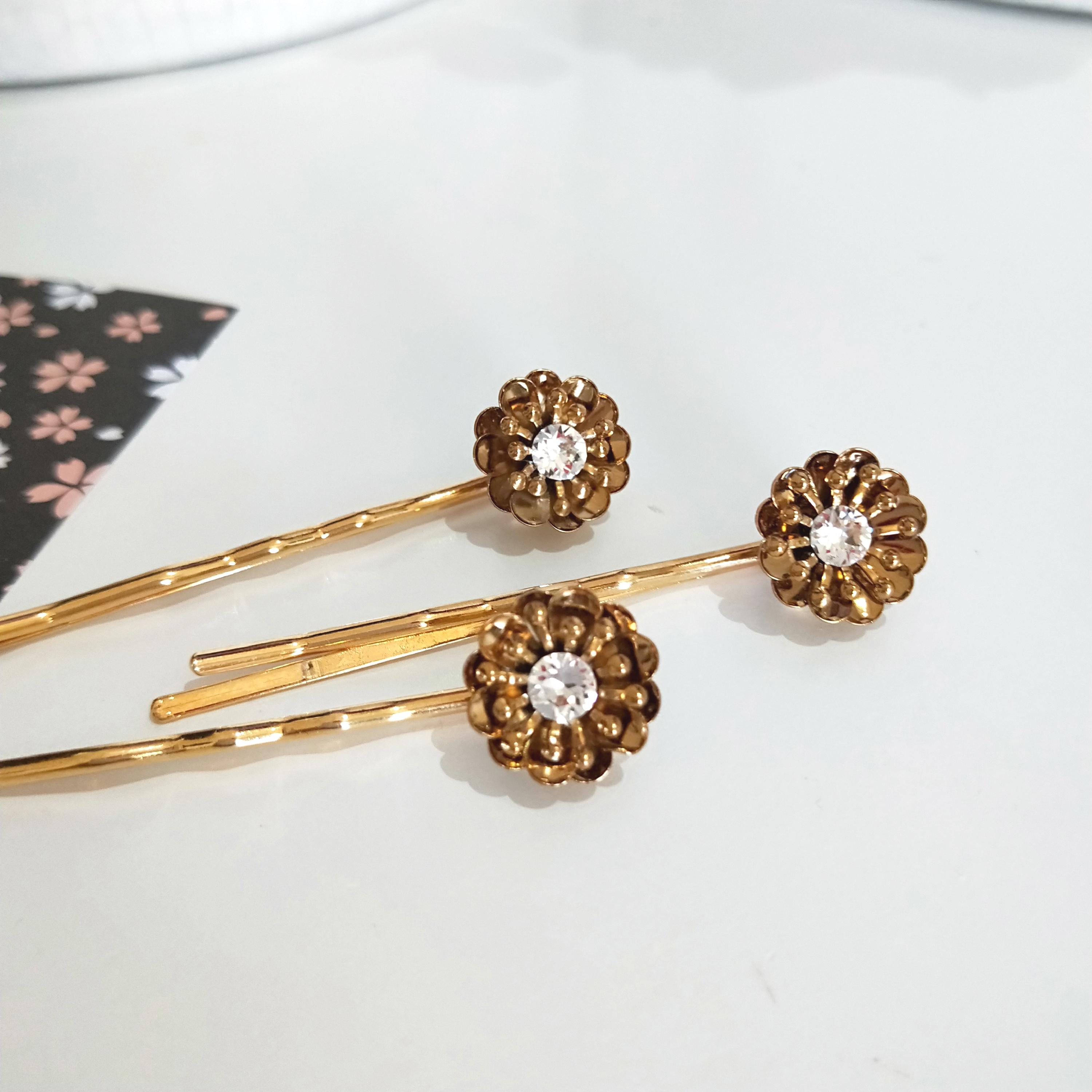 Lovely Sweet Set of 4 Bridal Hair Pins Swarovski Crystal Gold Cherry Flower Hair Pins, Sakura Flower Inspired Spring Wedding Hair Pins. Perfect hair clips to add your vintage, garden or outdoor romantic wedding hair style. Eye-catching with a vintage glamour twist! Great for bride or bridesmaids on Spring weddings.