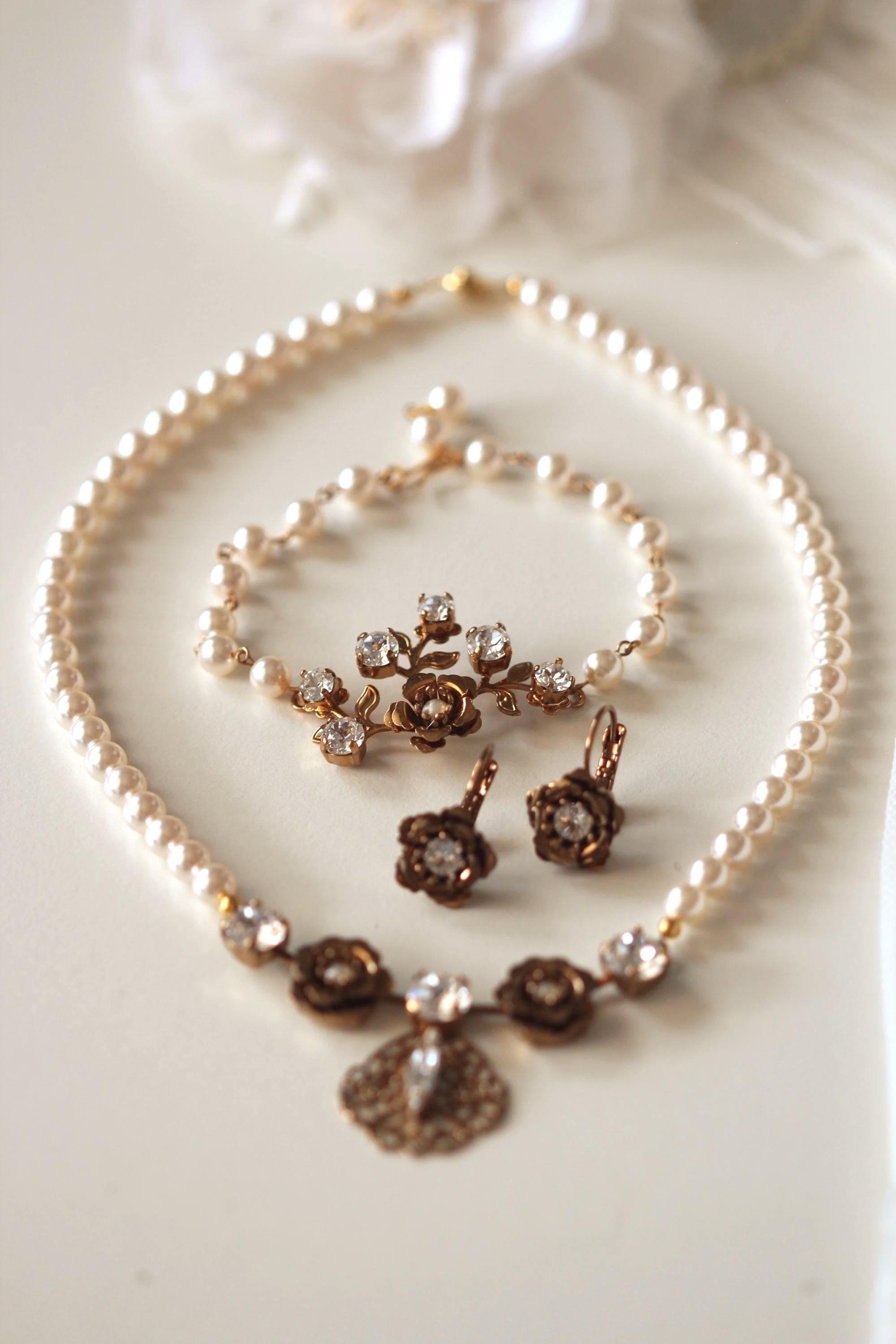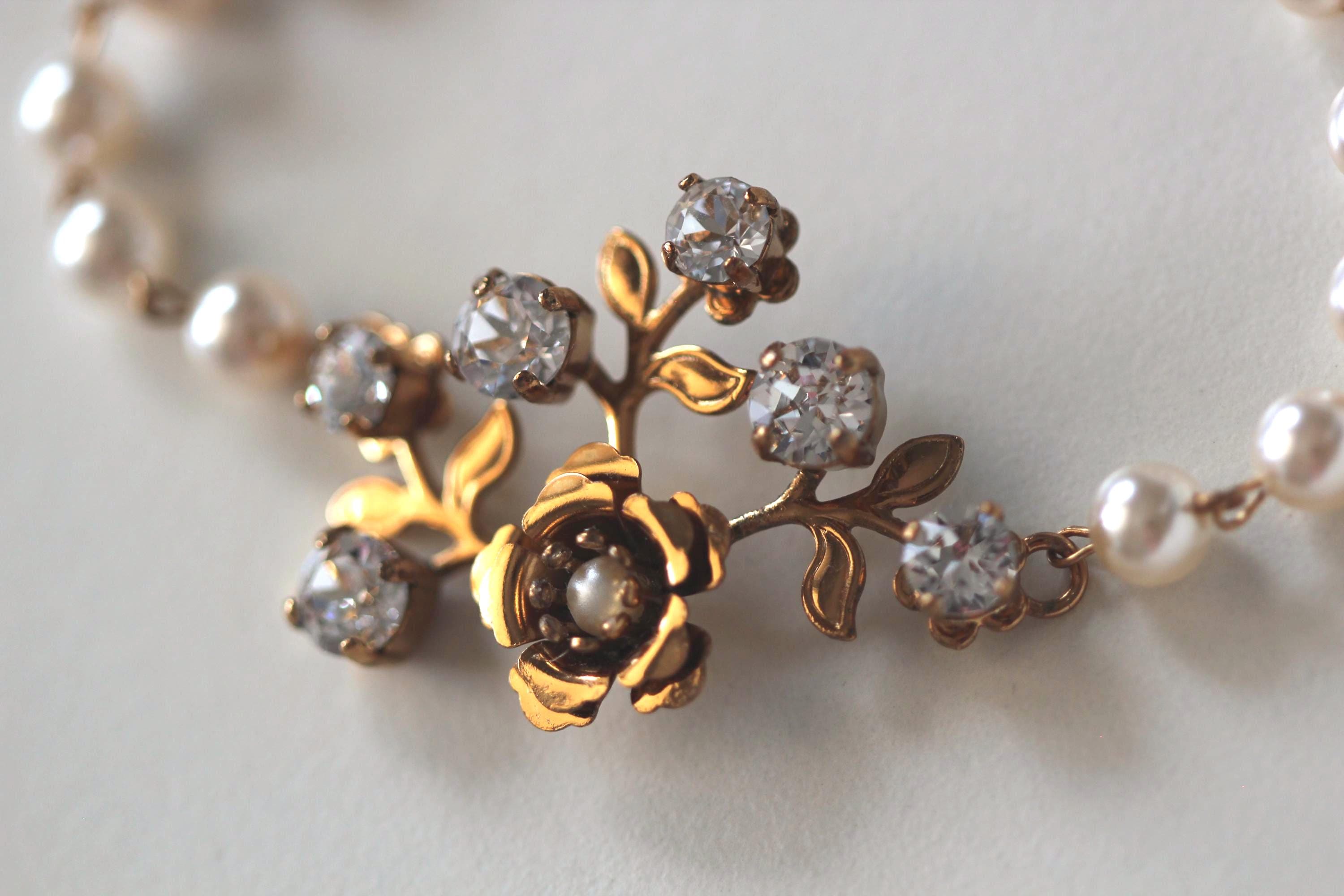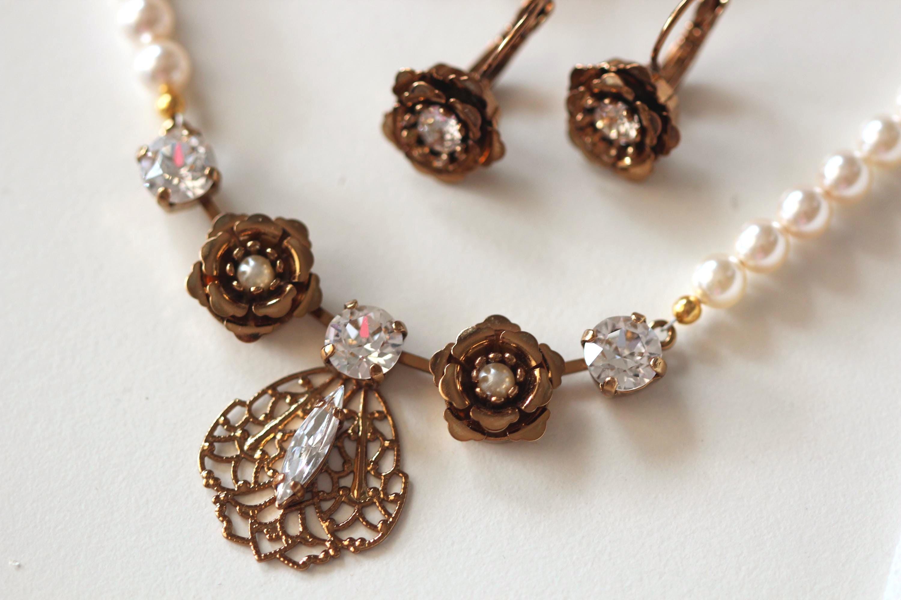 A Modern Vintage Style Vintage Gold Bronze Colored Gold Bridal Bracelet, Bridal Necklace, Bridal Earrings. Vintage Glamour Wedding Bridal Jewelry Vintage Gold Flower Finest Austrian crystal Bracelet Earrings Set. Eye-catching with a vintage glamour twist!