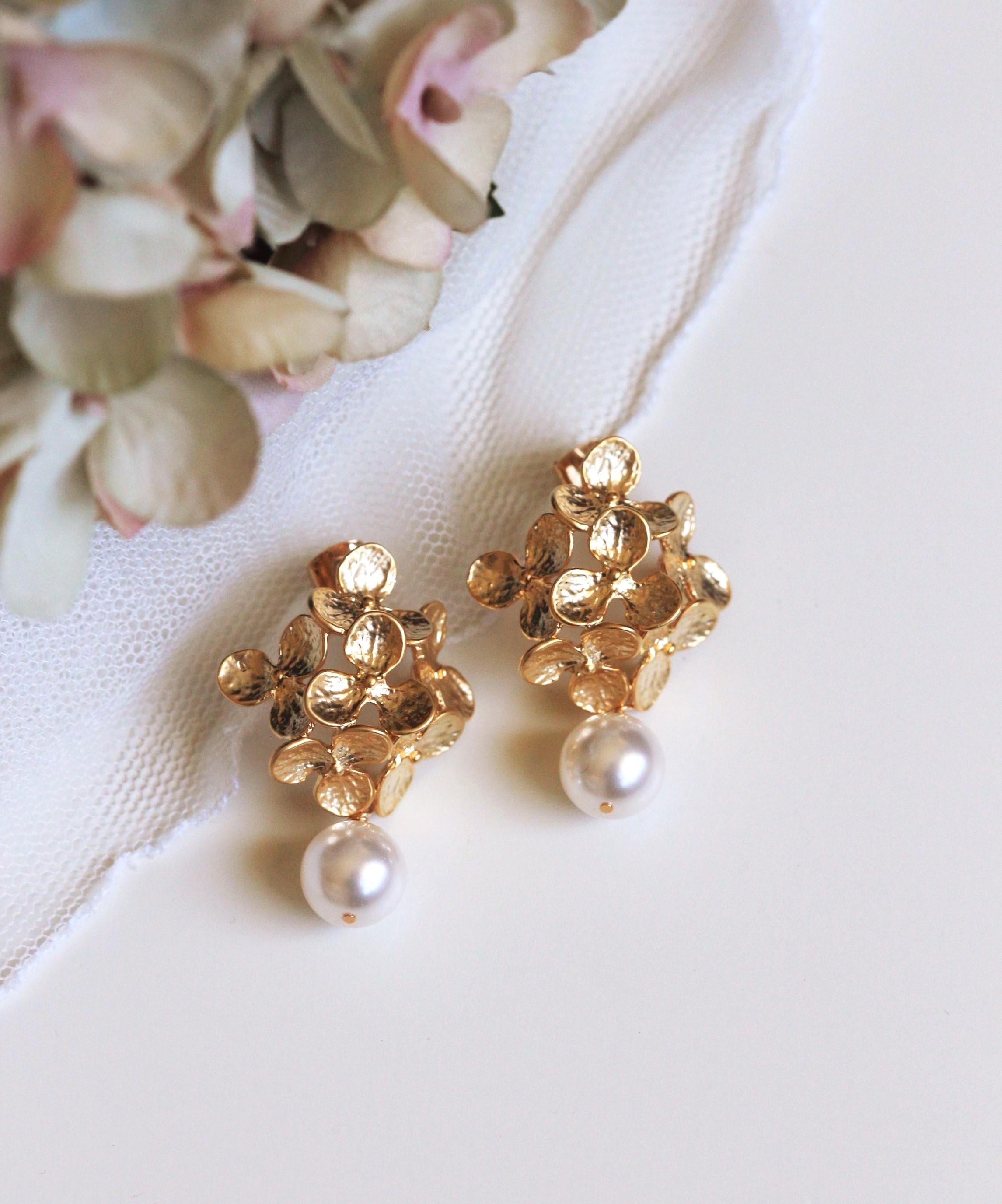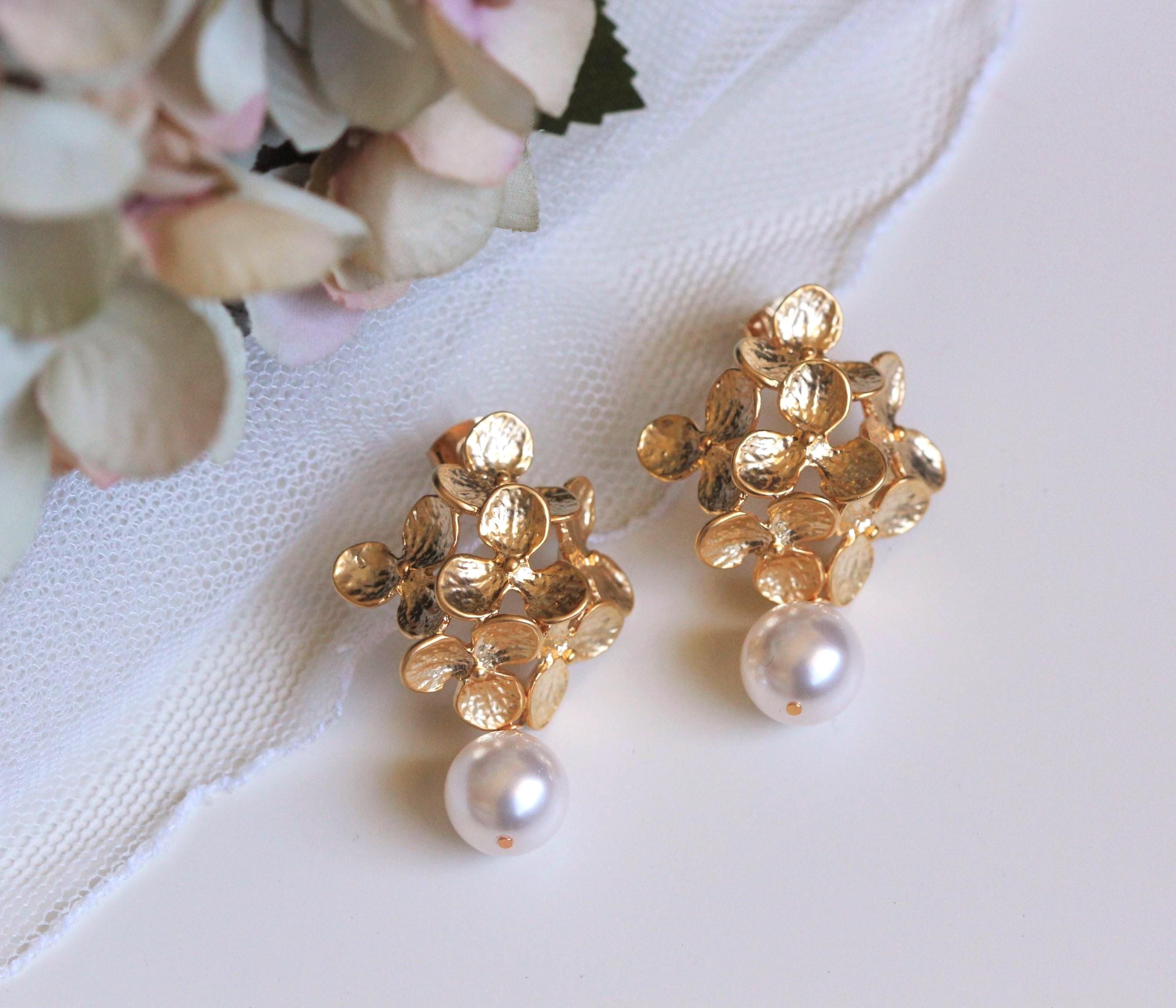 Unique Gold Bridal Earrings Vintage Style Hydrangea Gold Flower Earrings Bridal Pearl Earrings Romantic Large Statement Earrings Gold Wedding Earrings