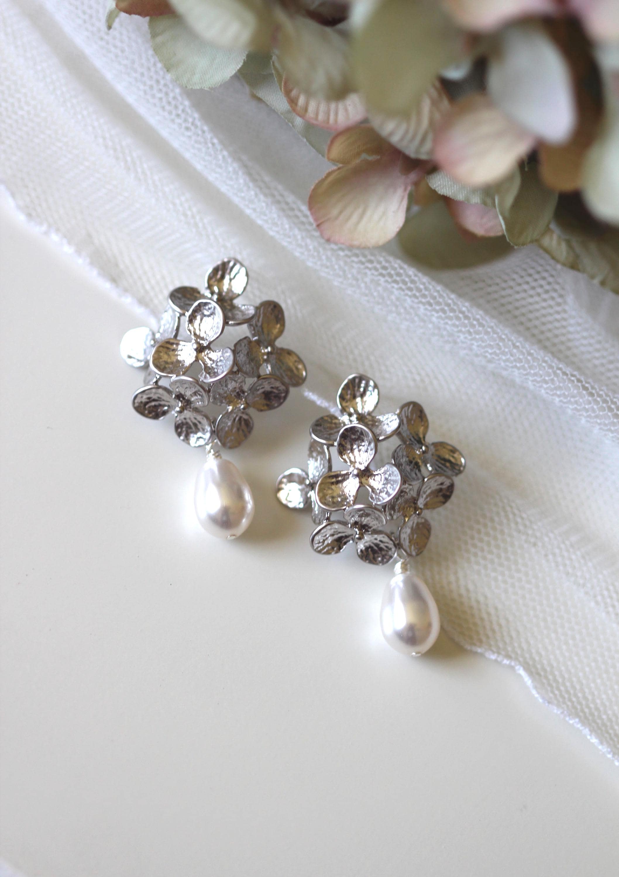 Romantic spring hydrangea flower with crystal drop earrings for brides: