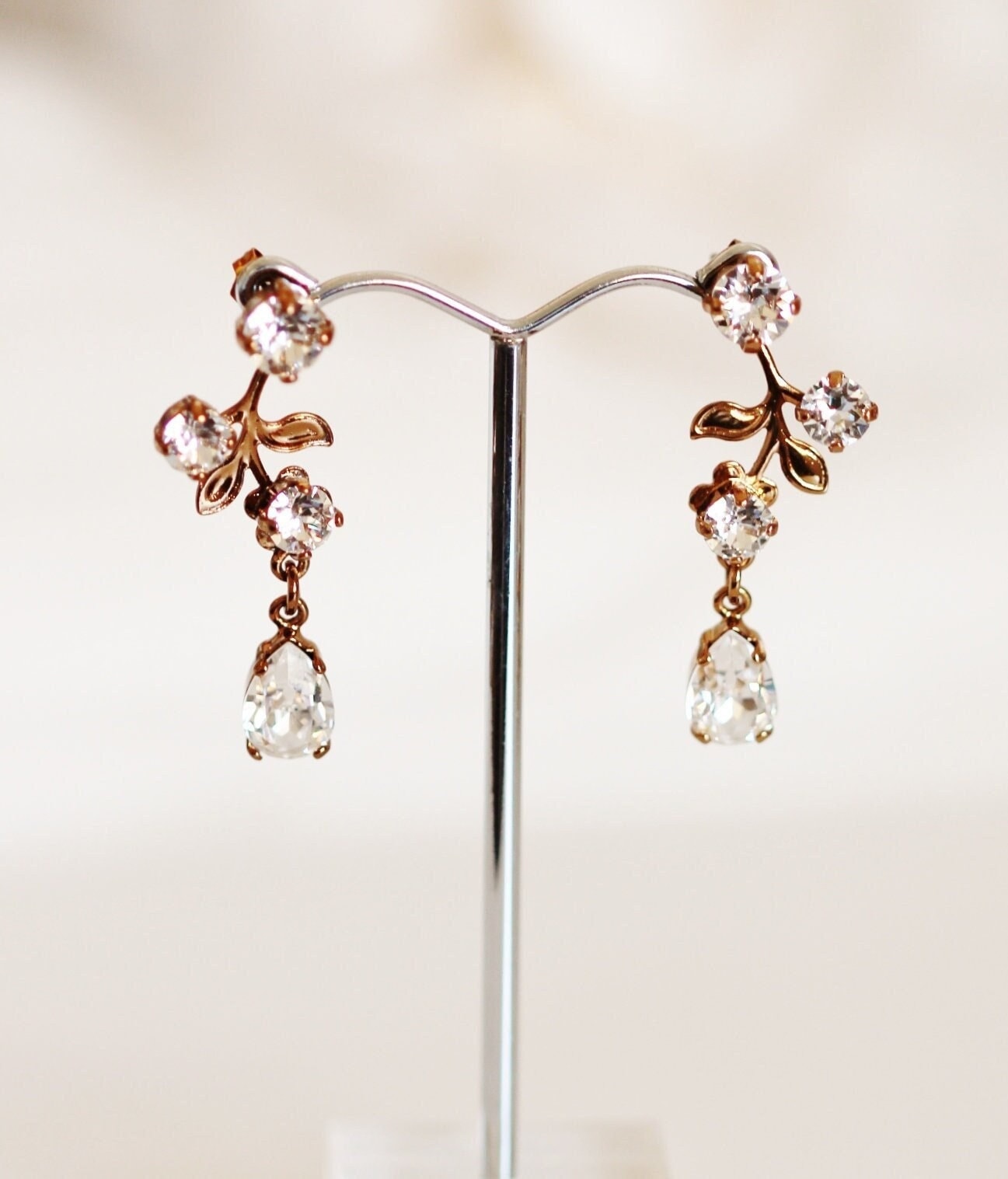 A Delicate Sparkly Vintage Gold Leaf Bridal Earrings Romantic Wedding Bridal Jewelry Finest European Premium Drop Crystal Earrings. Exquisite Gold Bridal Earrings with a Touch of Vintage Glamour. Sparkling Rhinestone Earrings - Timeless Beauty for Her Special Day and Beyond.