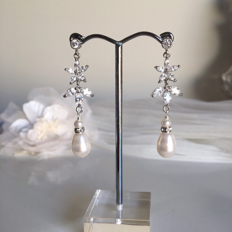 A Romantic and Elegant Cherry Blossom Crystal Floral and Leaf Earrings with Dangle Drop Pearl Earrings Romantic Wedding Bridal Jewelry. Gorgeous flower blossom earrings for weddings or other special occasions.