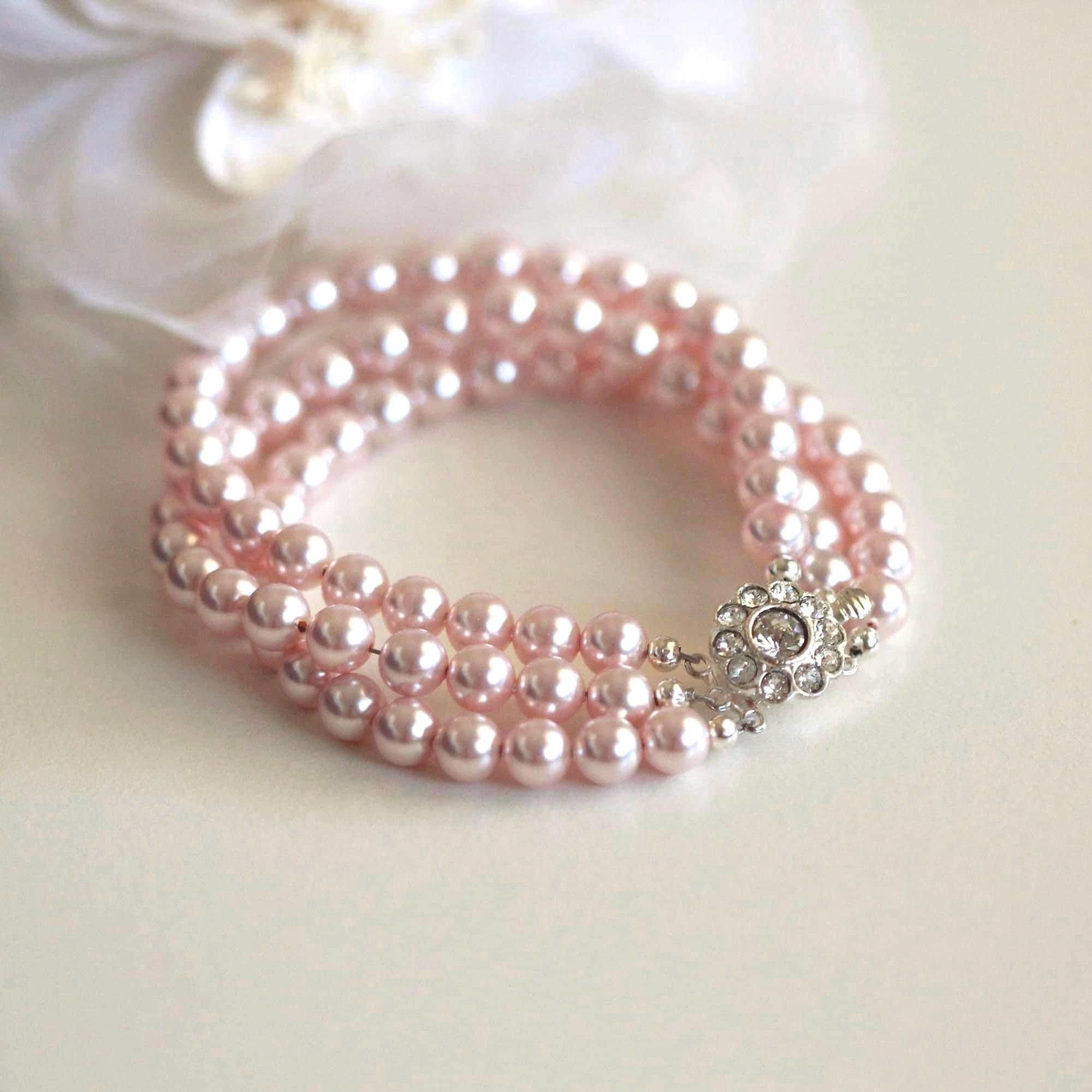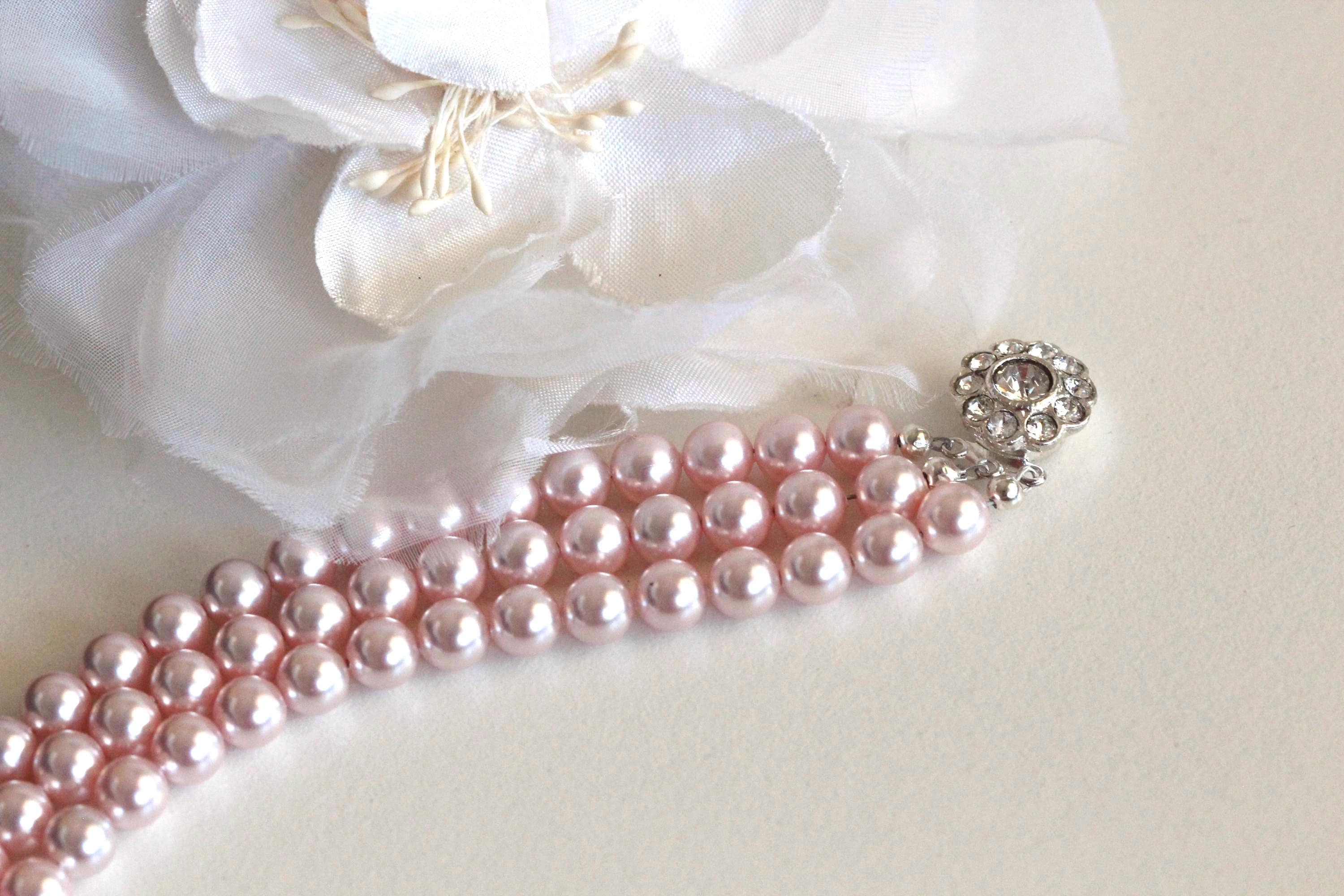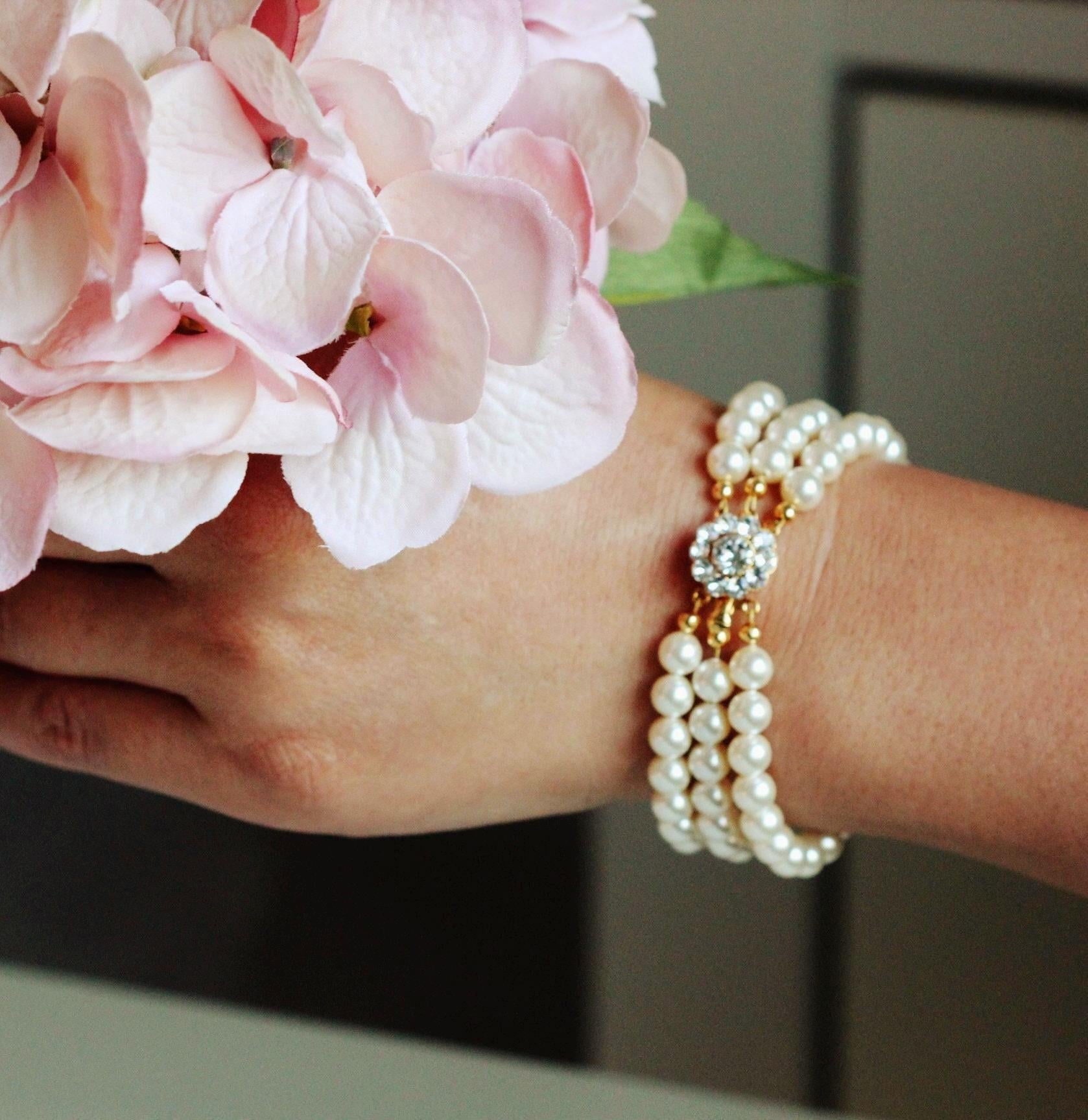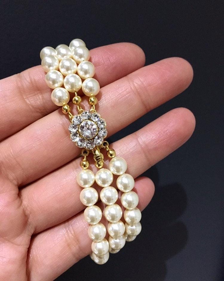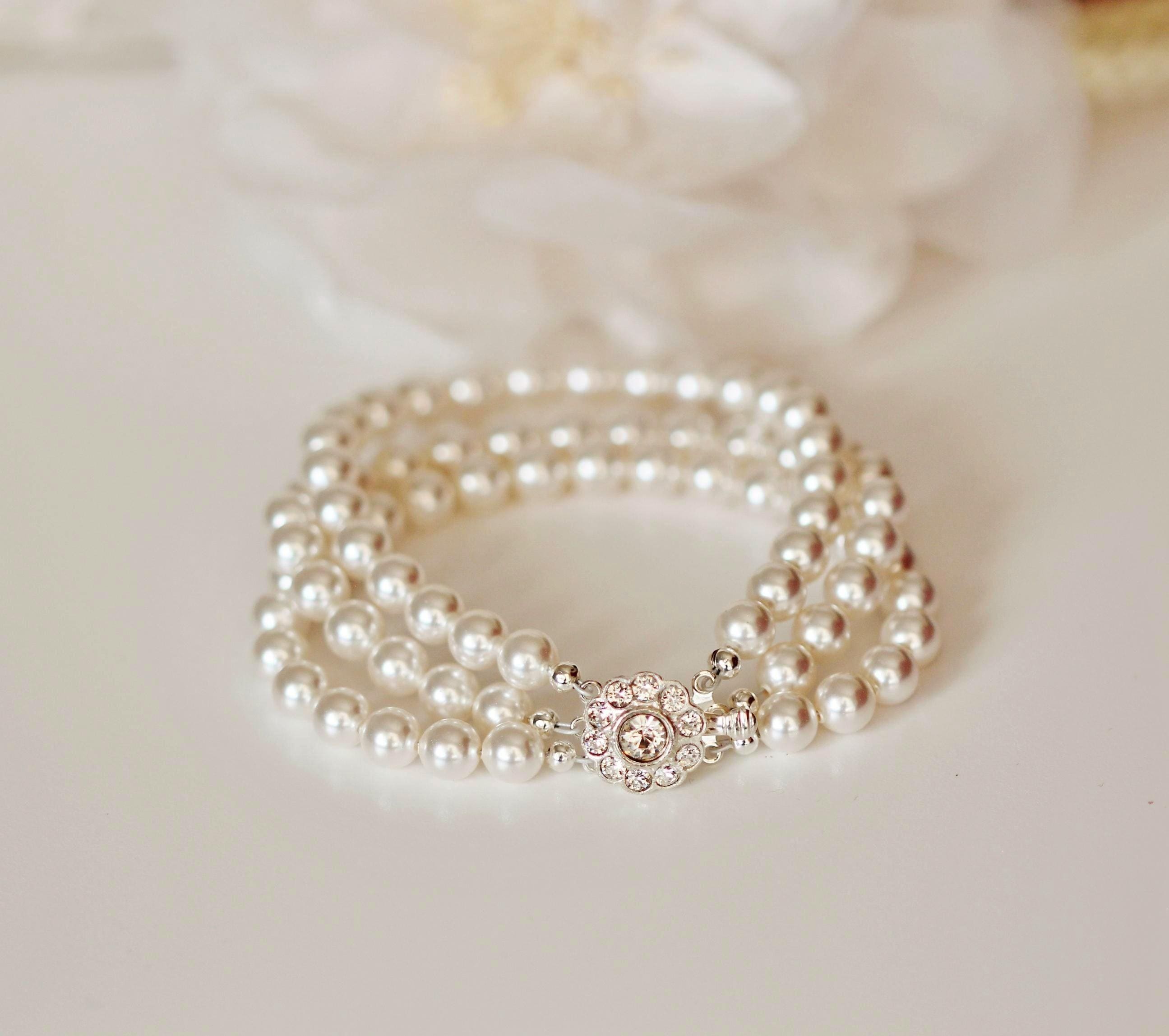 Handmade Elegant and Stunning Vintage Style three Strand Pearl Bridal Bracelet Silver Wedding Bracelet Finest Austrian crystal Bracelet Silver Wedding Jewelry Vintage style Bridal Bracelet. Timeless Victorian Style Pearl Bridal Bracelet - Handcrafted Gift for Bride or Mother of the Bride, Mother of the Groom.