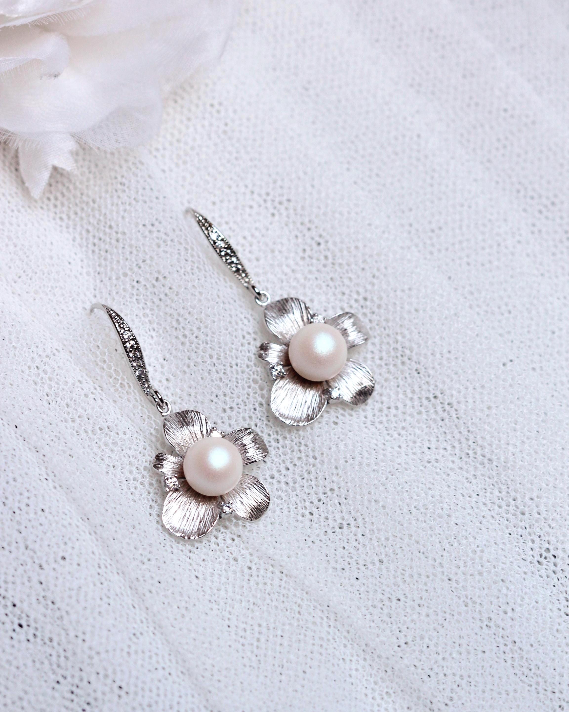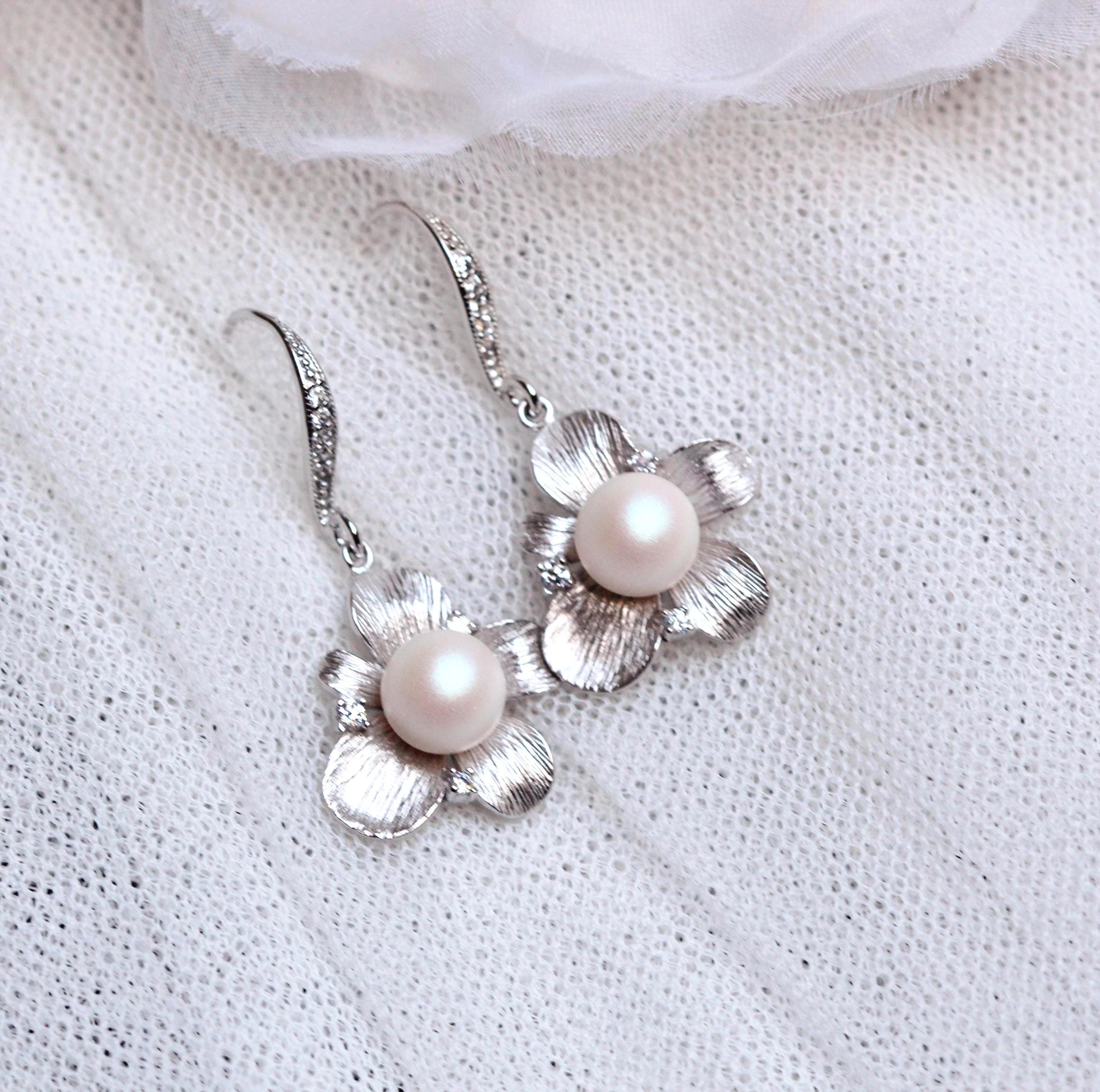 Delicate and graceful, this silver floral pearl jewelry set is a beautiful gift to the bride. Featuring a matching necklace and earrings with soft pearlescent white pearls and hydrangea flower details, it's a timeless & elegant bridal jewelry set for the wedding day.