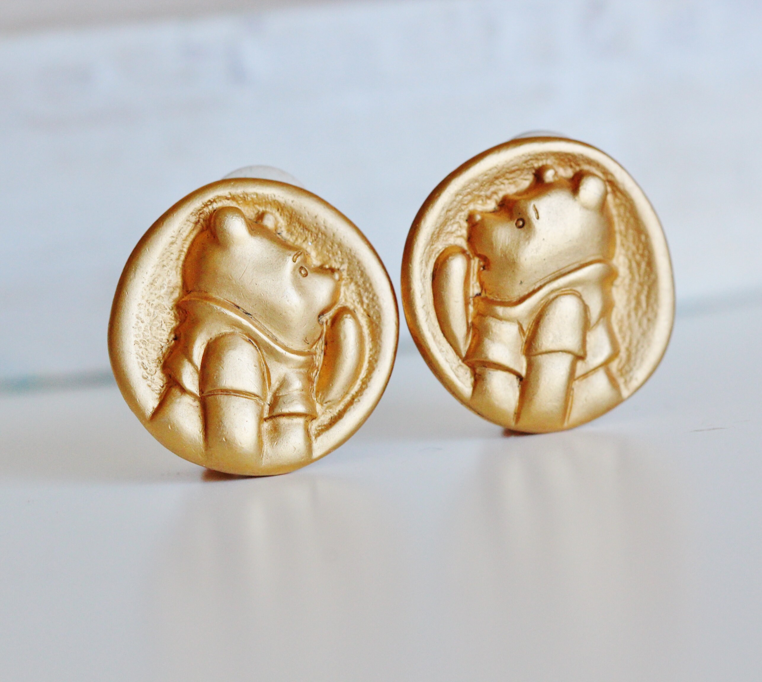 Disney Matt Gold Winnie The Pooh Bear Clip On Earrings, Genuine 1990's Vintage Jewelry Baby Shower Gift, Non-Pierced Earrings For Women