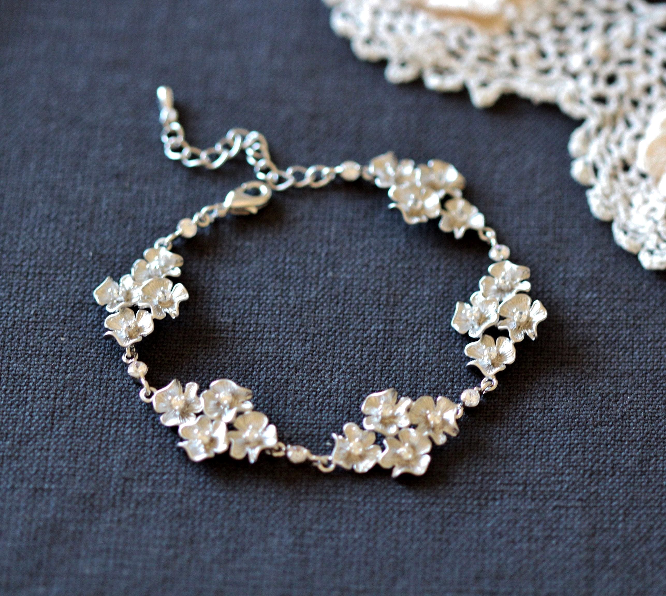 Dainty Silver Floral Bridal Bracelet Inspired By Cherry Flower Blossom Romantic Wedding Jewelry For Brides Cubic Zirconia Crystal flower Wedding Bracelet.